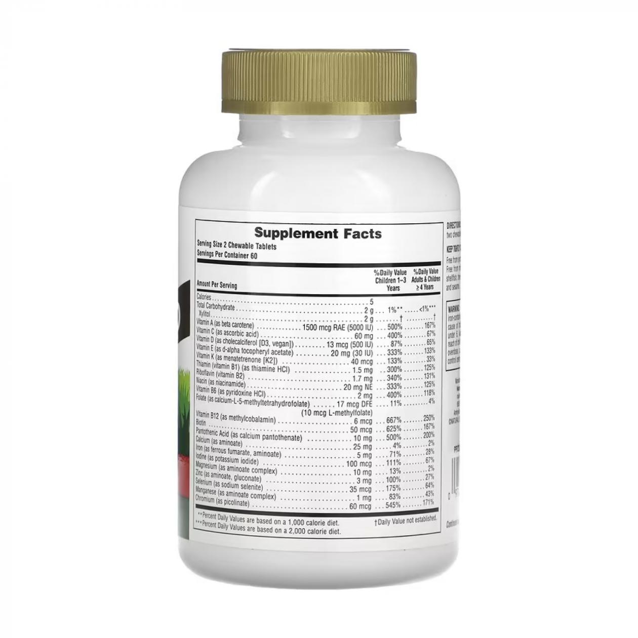 Ксилитол, натуральные ароматизаторы, стеарат магния, карбонат кальция, лимонная кислота, гуаровая камедь, сертифицированная по стандарту Organic Gold Standard смесь цельных продуктов (органическое яблоко, кудрявая капуста, листовая капуста ростки брокколи, корнеплод моркови, шпинат, томатный сок, спирулина, хлорелла, петрушка, голубика, экстракт ацеролы, свекольный сок, мицелий гриба-барана, мицелий гриба шиитаке, мицелий гриба кордицепса, черника, шиповник, цельнозерновой бурый рис, плоды папаи, плоды мальпигии (Malpighia glabra), морковь, йодид калия, плоды манго, инозитол, битартрат холина, брокколи, шпинат, яблочный пектин, стеариновая кислота. Минеральные аминоаты – это хелаты из цельного коричневого риса.