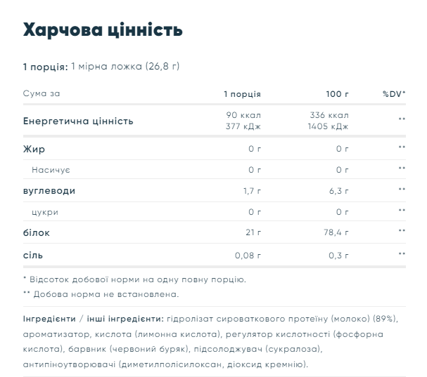 Clear Whey Isolate - это не просто еще один протеиновый коктейль. Мы взяли высококачественный гидролизованный изолят сывороточного протеина и создали легкую и освежающую альтернативу - это больше похоже на сок, чем на молочный протеиновый коктейль. И у него отличный вкус, с множеством вкусов на выбор, включая горький лимон, апельсиновое манго, персиковый чай, мохито и радужные конфеты. 20 г белка Легкий и освежающий Без молочного вкуса или текстуры 4 г BCAA и 3 г глутамина С низким содержанием сахара Фруктовые ароматы Каждая вкусная порция содержит 20 г белка, который помогает нарастить и поддерживать важные мышцы, что важно независимо от ваших целей в фитнесе. А всего 0,1 г жира, 0,3 г сахара и менее 90 калорий на коктейль - это идеальный способ избежать обезвоживания в течение дня - не сводя на нет всей вашей тяжелой работы. Состав: гидролизат сывороточного протеина ( молоко ) (96%), натуральный ароматизатор, кислота (лимонная кислота), регулятор кислотности (фосфорная кислота), противовспенивающие агенты (диметилполисилоксан, диоксид кремния), подсластитель (сукралоза).
