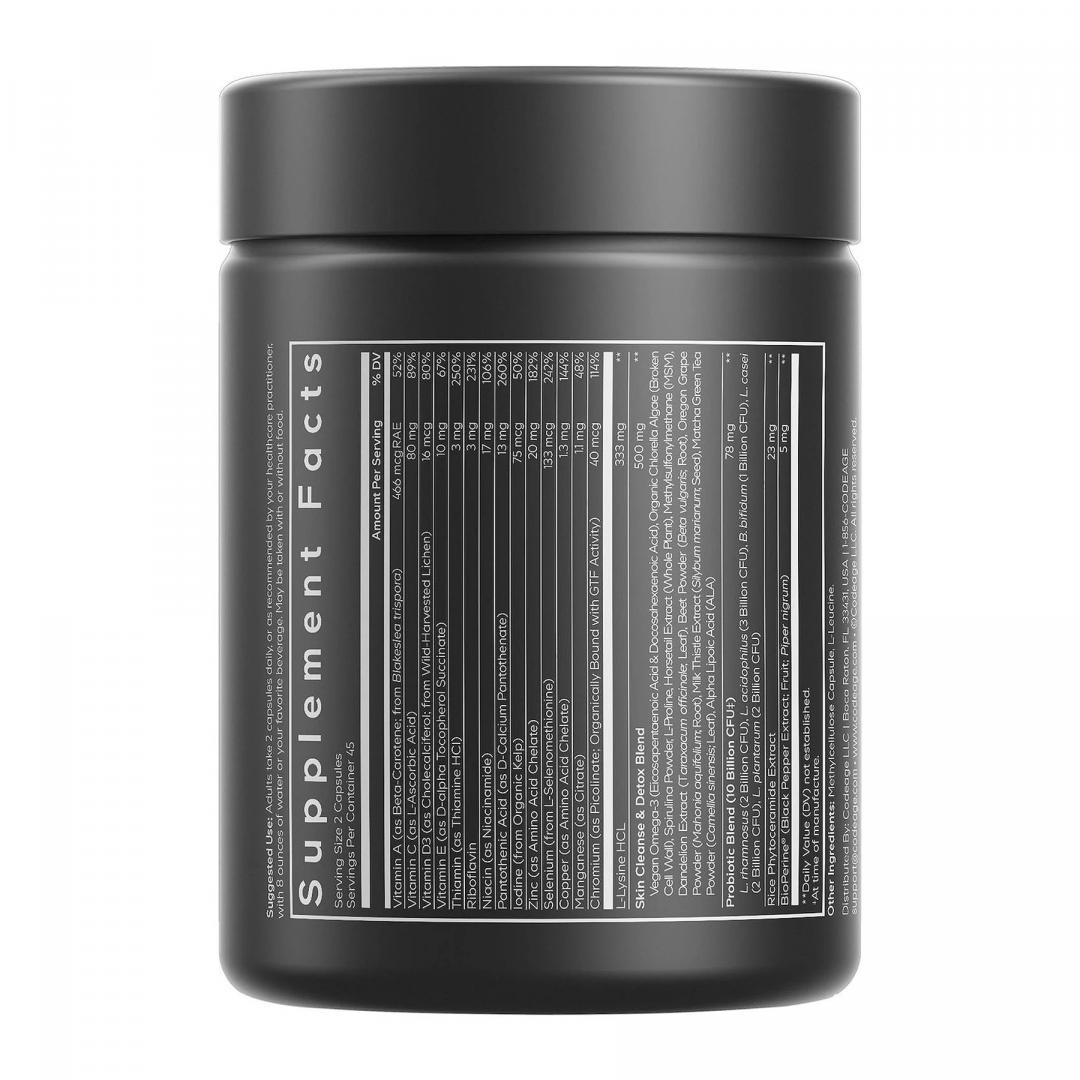 Добавка с витаминами для лица Codeage содержит фитоцерамиды, марганец, хром, МСМ, порошок из листьев зеленого чая матча и экстракт семян расторопши.