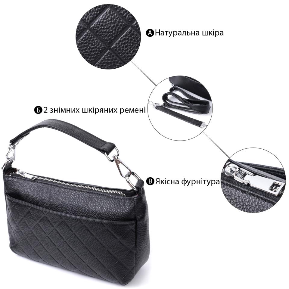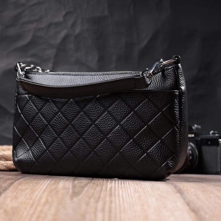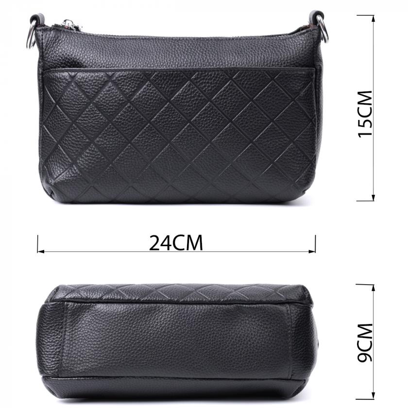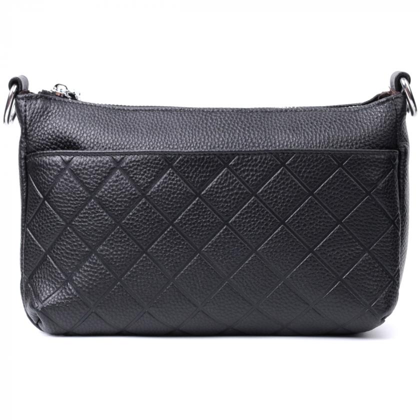 Прямоугольная сумка для женщин в классическом черном цвете из натуральной мягкой кожи высокого качества. Изделие очень удобное, можно носить на плече и в руках. На лицевой стороне сумка декорирована ромбовидным тиснением, что придает особого шарму изделию. Модель дополнена фурнитурой цвета серебра. Аксессуар имеет три отделения, и два кармашки - один на молнии и один открытого типа, в отделении, что посередине. Идеальный вариант сумки на каждый день.