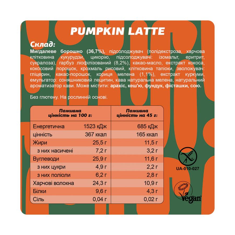 Состав: миндальная мука (36,7%), подсластитель (полидэкстроза, пищевая клетчатка кукурузы, цикория, подсластители: изомальт, эритрит, сукралоза), тыква лиофилизированная (8,2%), какао-масло, кокос, экстракт клетчатка тапиоки, увлажнитель: глицерин, какао-порошок, корица молотая (1,1%), экстракт куркумы, эмульгатор: подсолнечный лецитин, кофе натуральный молотый, натуральный ароматизатор кофе. Масса нетто: 45г.