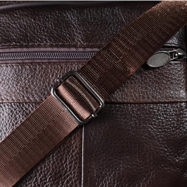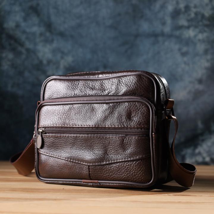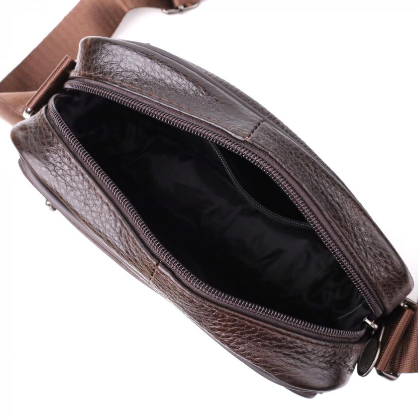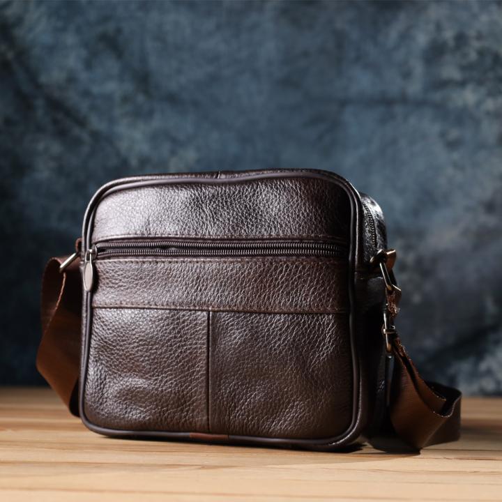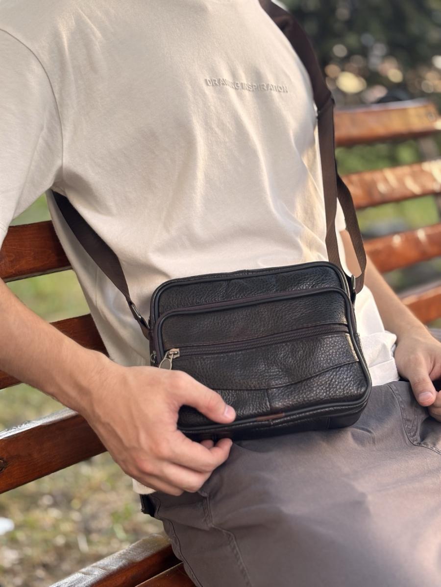 Стильная мужская сумка из высококачественной натуральной кожи, устойчивая к повреждениям и износу. Эффектный и практичный аксессуар с одним основным отделением и тремя дополнительными карманами для хранения аксессуаров, телефона и других мелочей. Ремень сумки выполнен из прочного текстиля и регулируется по длине, что обеспечивает удобство при носке. Благородный коричневый цвет модели делает её универсальной и идеально подходящей как для повседневного использования, так и для деловых встреч. Эта сумка станет отличным выбором для мужчины, ценящего комфорт и стиль в каждой детали.