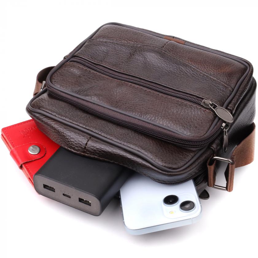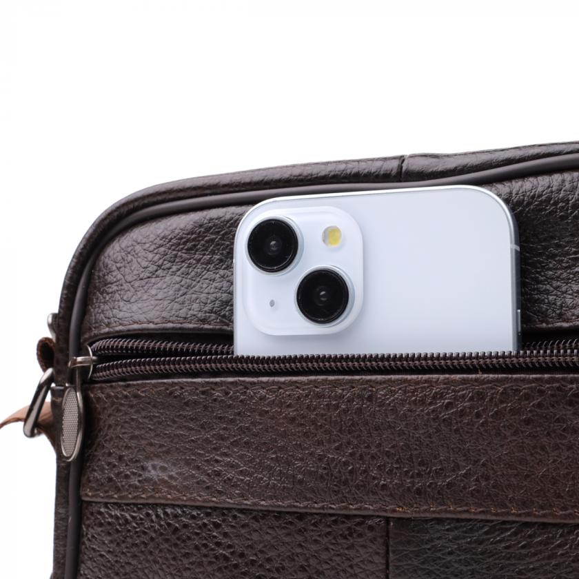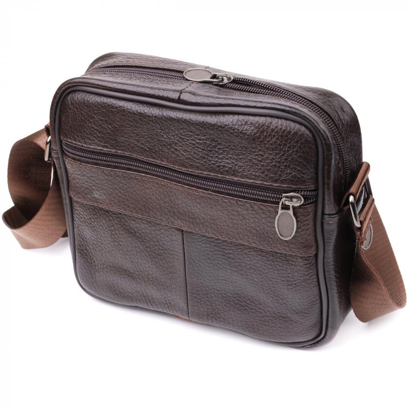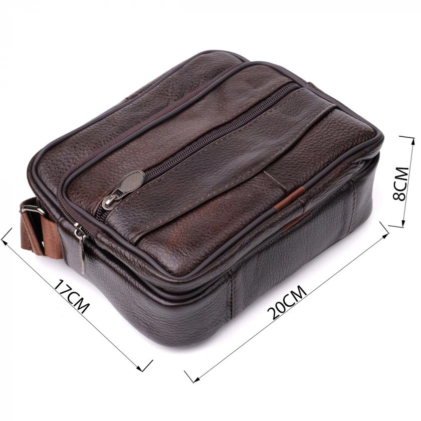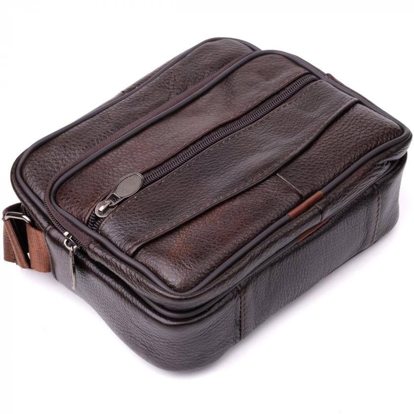 Стильная мужская сумка из высококачественной натуральной кожи, устойчивая к повреждениям и износу. Эффектный и практичный аксессуар с одним основным отделением и тремя дополнительными карманами для хранения аксессуаров, телефона и других мелочей. Ремень сумки выполнен из прочного текстиля и регулируется по длине, что обеспечивает удобство при носке. Благородный коричневый цвет модели делает её универсальной и идеально подходящей как для повседневного использования, так и для деловых встреч. Эта сумка станет отличным выбором для мужчины, ценящего комфорт и стиль в каждой детали.