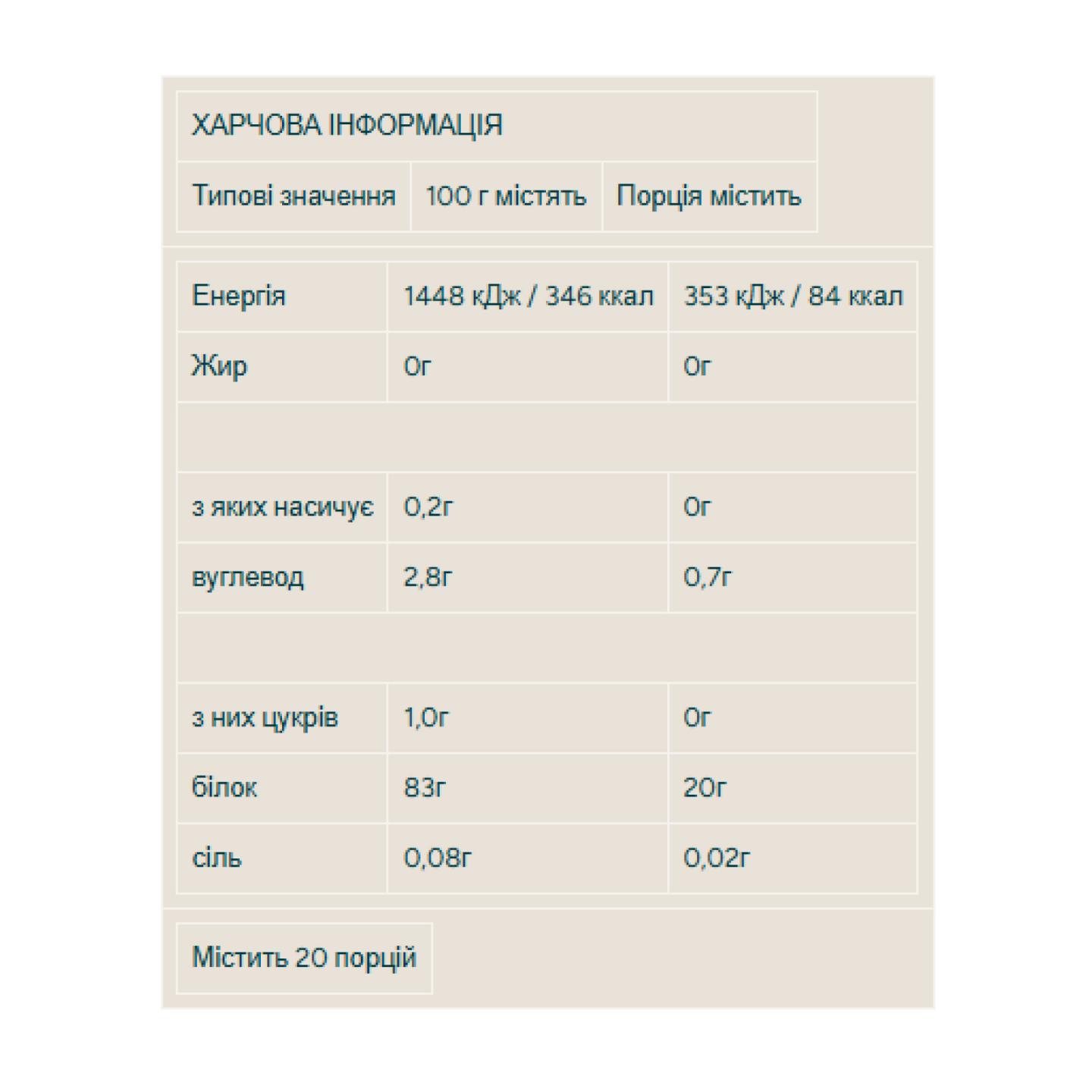 20 г белка на порцию из гидролизованного изолята быстро усваивающегося сывороточного белка.