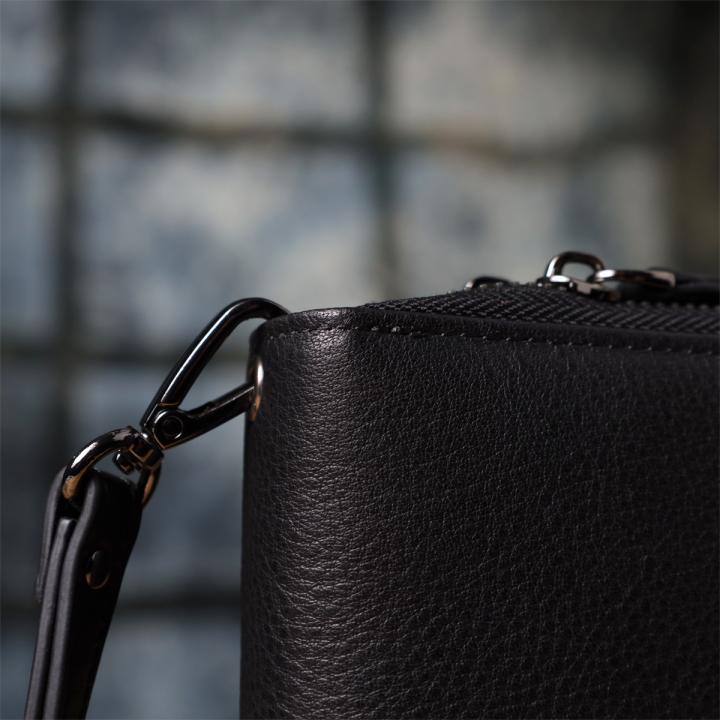 На тыльной стороне расположена кожаная ручка для комфортной переноски, а съёмный кистевой ремень позволяет носить клатч на запястье. Универсальный вариант как для деловых встреч, так и для повседневного использования.