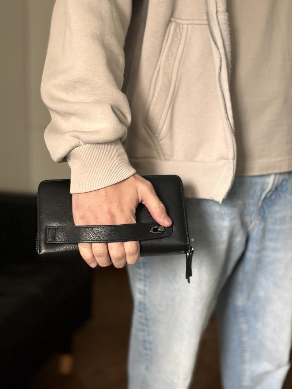 - снаружи на тыльной стороне мужского клатча расположена ручка для переноски в руке;
