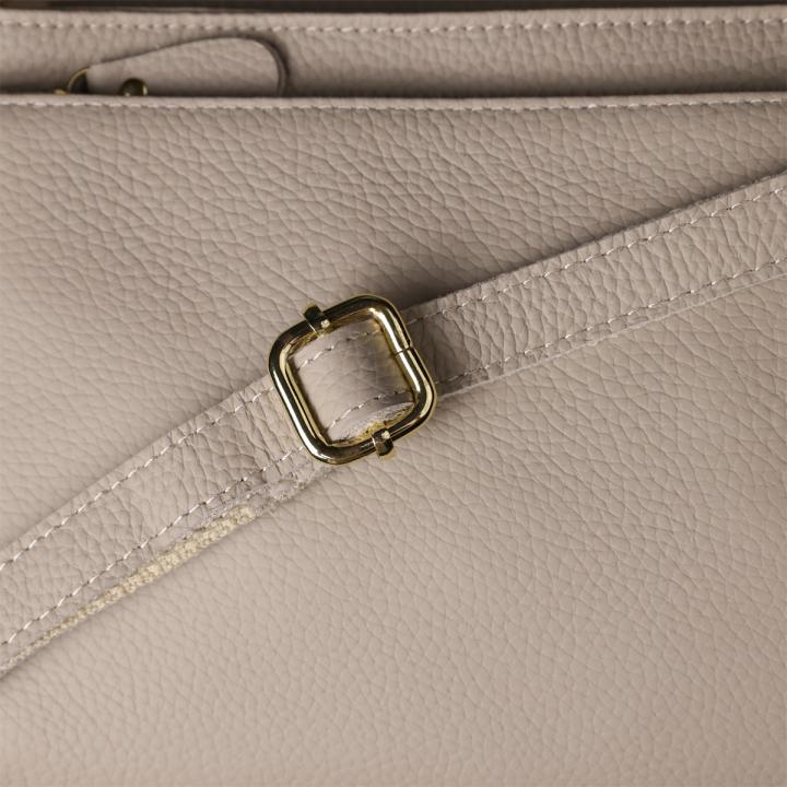 Сумка оснащена одним съёмным кожаным ремешком, который можно носить на плече или через плечо, делая аксессуар максимально универсальным и комфортным. Фурнитура выполнена в тёплом цвете жёлтого золота, добавляющем контраст и изысканность к сдержанному серому оттенку кожи.