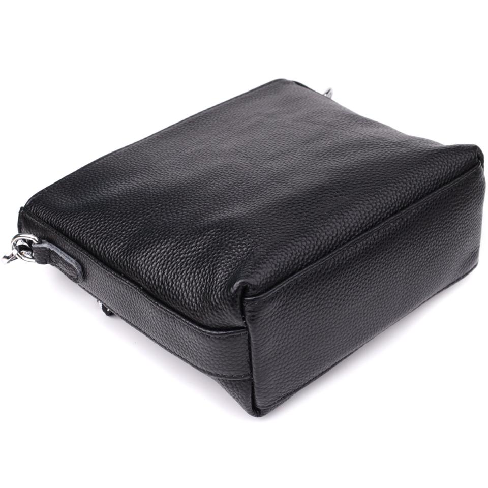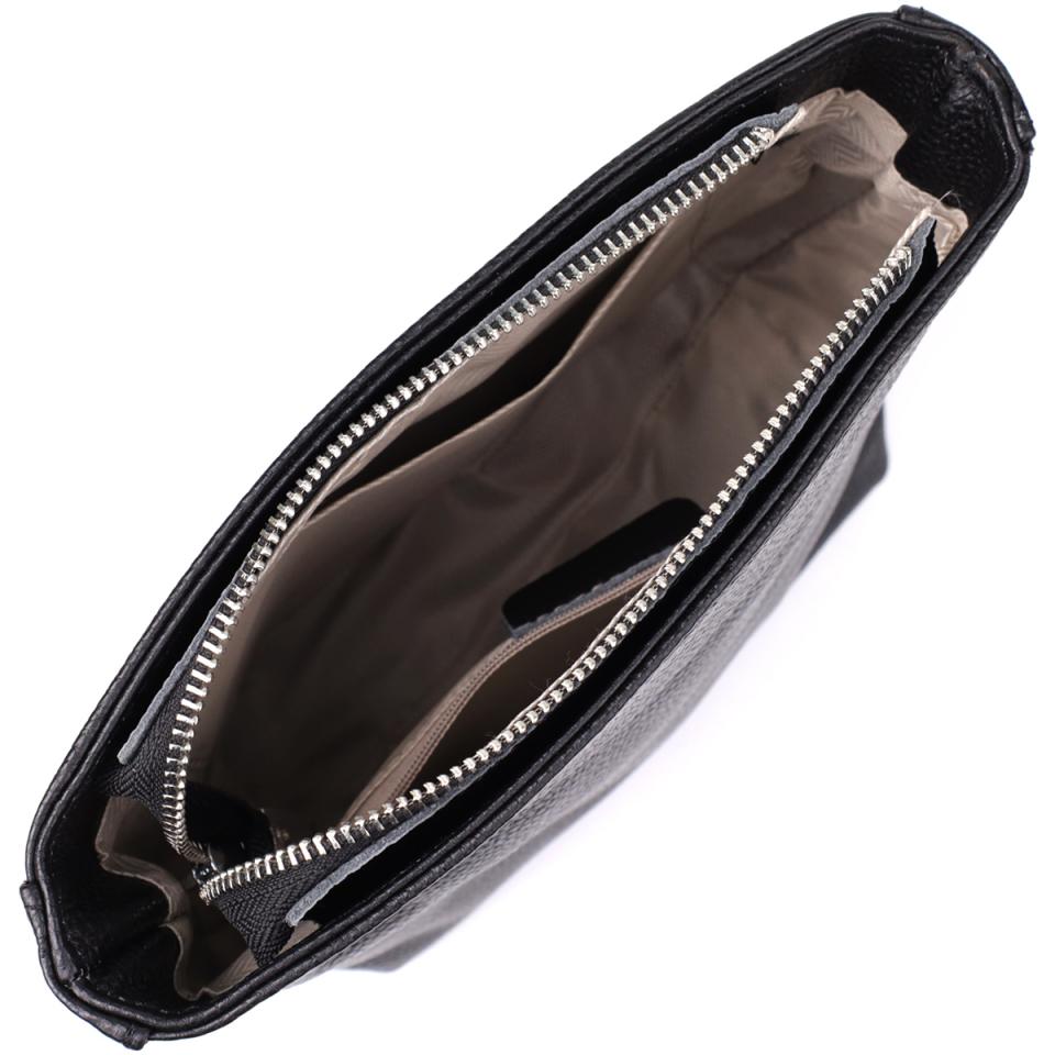 Оригинальная и стильная черная сумка из натуральной кожи — идеальный аксессуар для повседневного использования и деловых образов. Модель оснащена одним основным отделением, которое закрывается на молнию, обеспечивая надежное хранение ваших вещей. Внутри находятся два удобных кармана: потайной на молнии — для документов или ценных мелочей, и открытый — для телефона, ключей или других необходимых предметов.