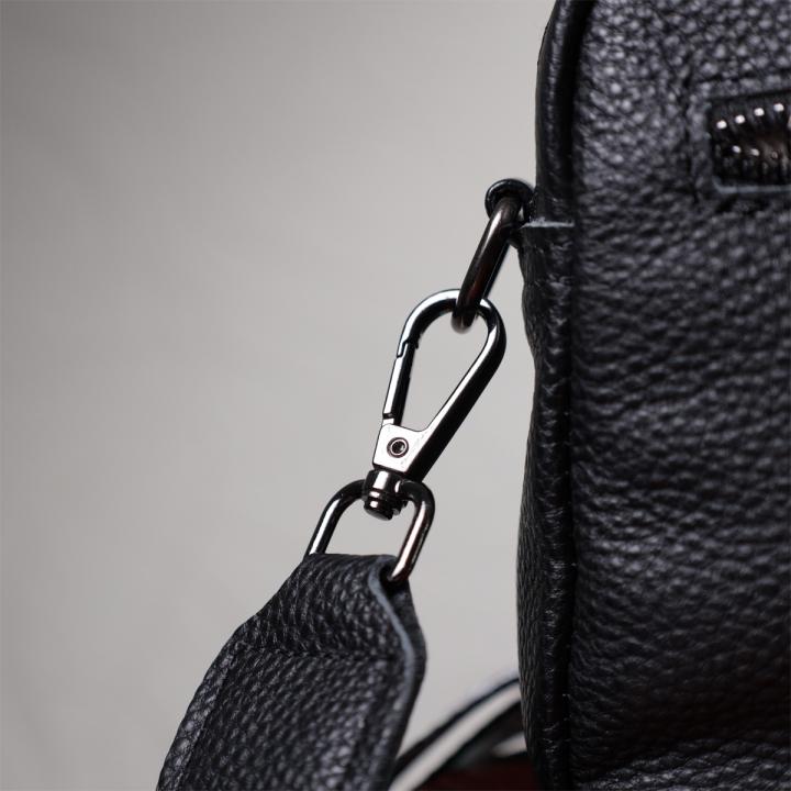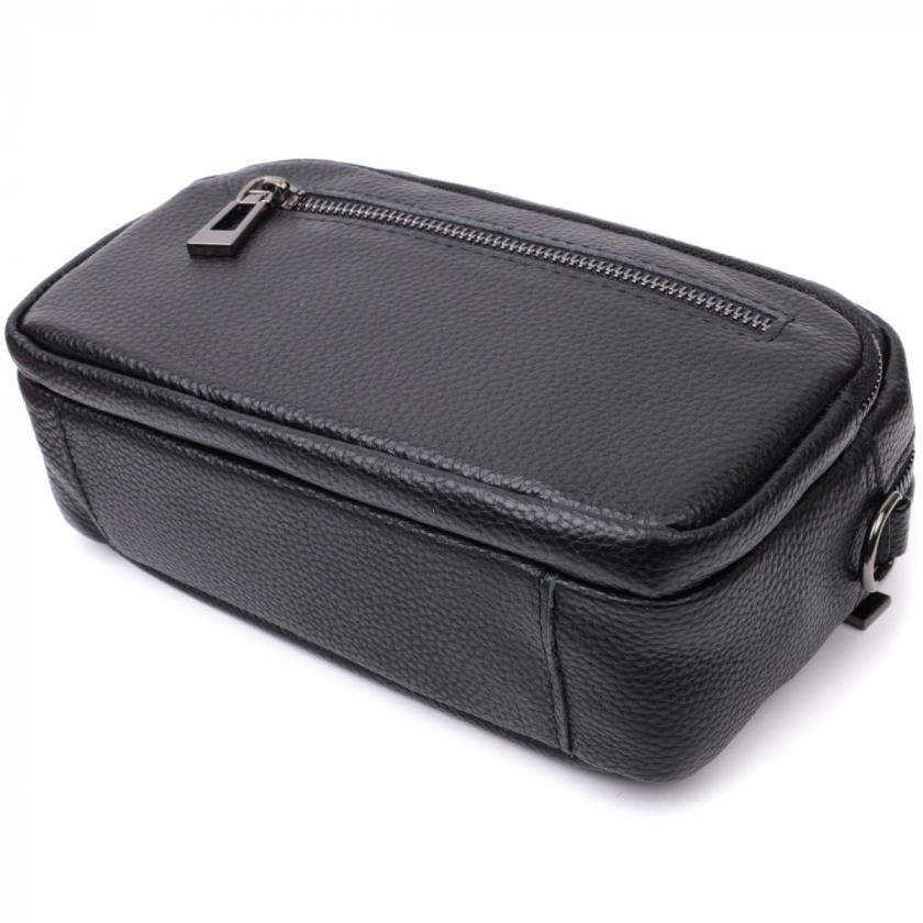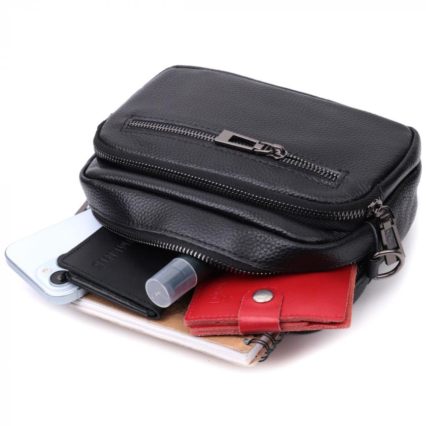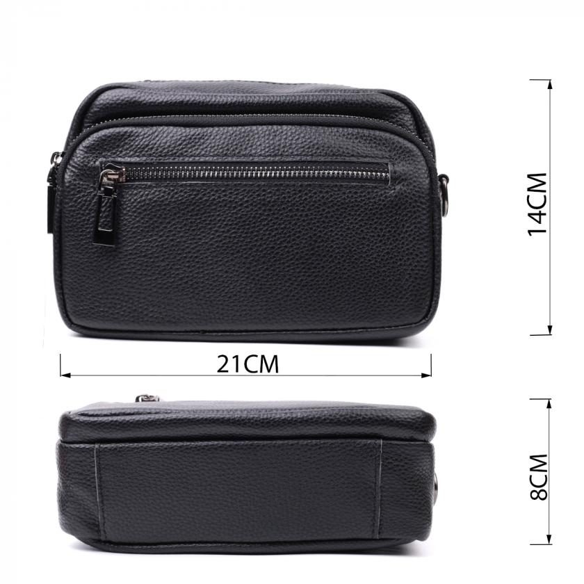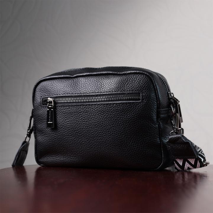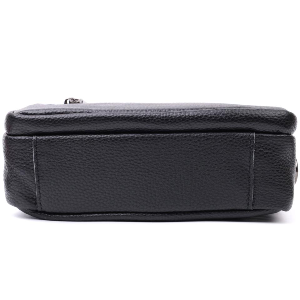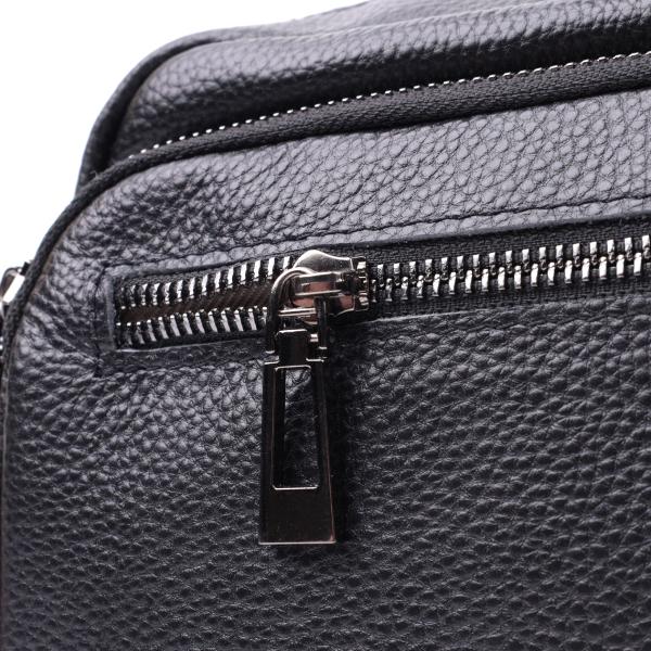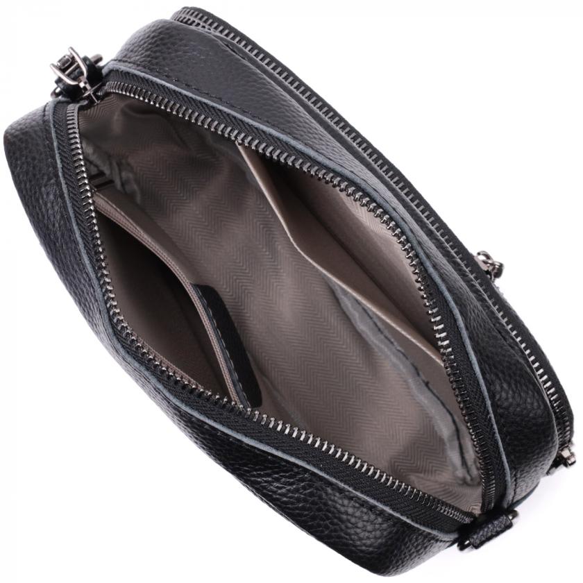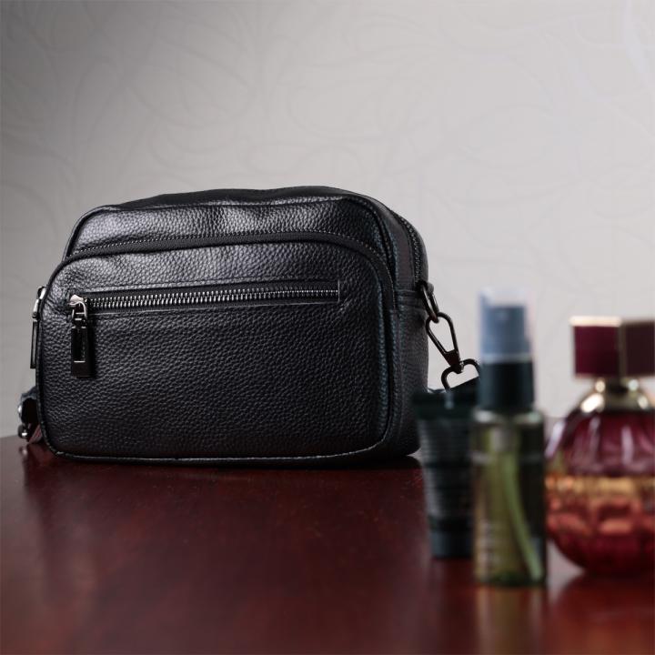 Женская компактная сумка в классическом черном цвете из натуральной кожи. Аксессуар состоит из основного отделения, что закрывается на молнию, кармана открытого типа и кармана на молнии внутри и трех карманов снаружи. Носить сумку можно на плече и через плечо, также можно носить как клатч под рукой, для этого можно снять текстильный ремешок.