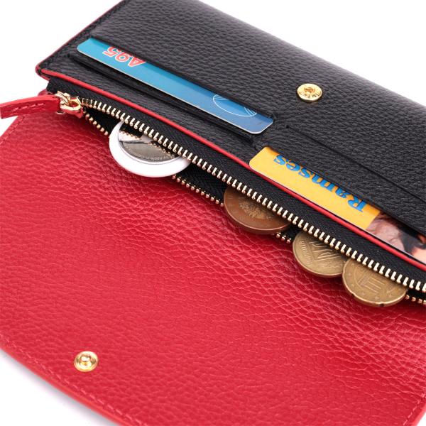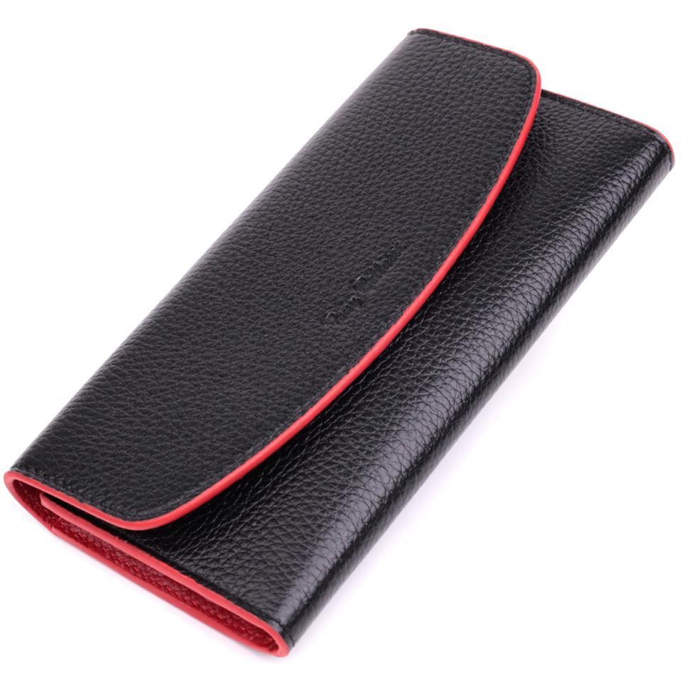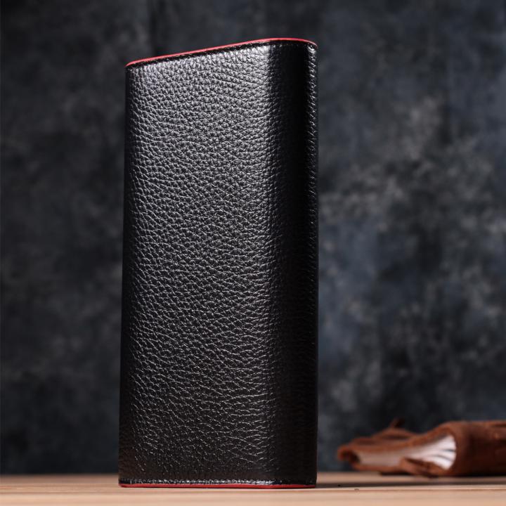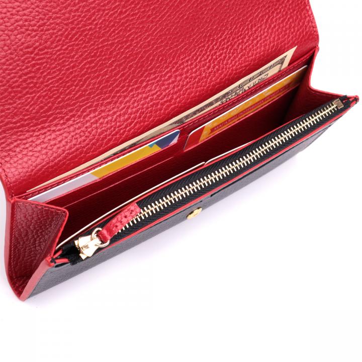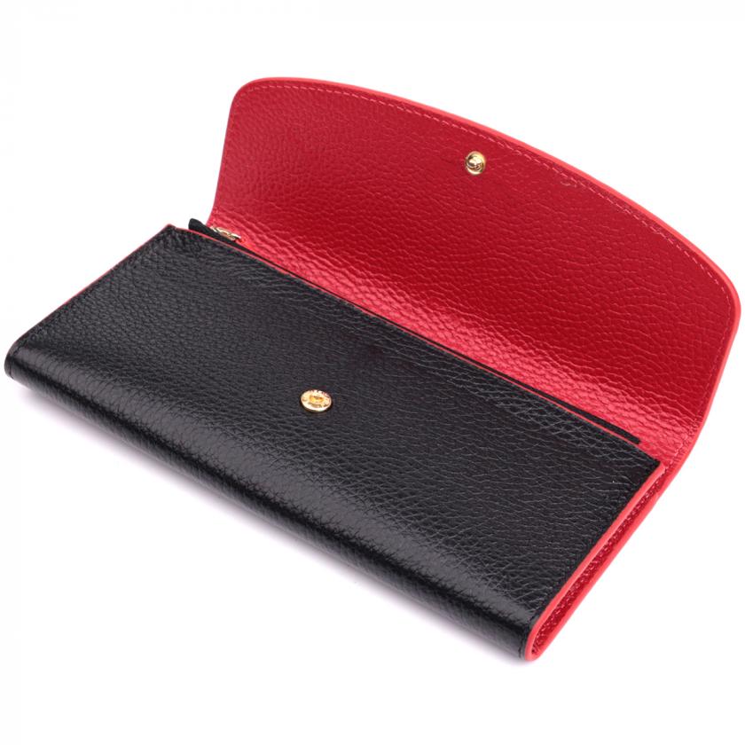 Вместительный женский кошелек из натуральной кожи, в комбинации из двух цветов черного снаружи и красного внутри. Аксессуар состоит из одного широкого отделения для купюр, двенадцати ячеек для пластиковых карт, одного прилегающего кармана и монетницы на молнии. В изделии использована качественная фурнитура золотистого цвета. Закрывается кошелек клапаном на кнопку. Покупая этот кожаный кошелек, Вы не только приобретаете стильную вещь, но и получаете качественный аксессуар, который прослужит не один год.