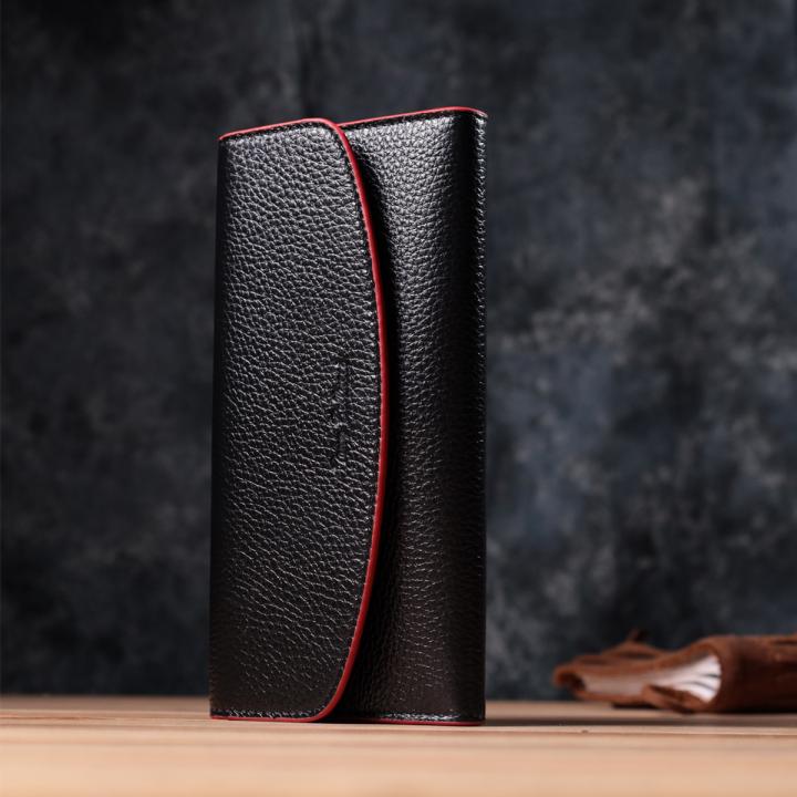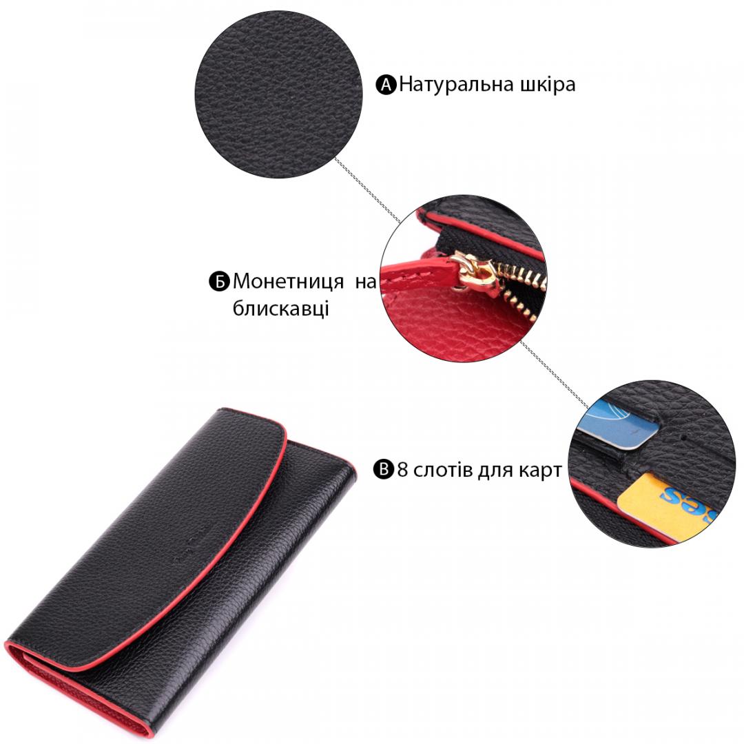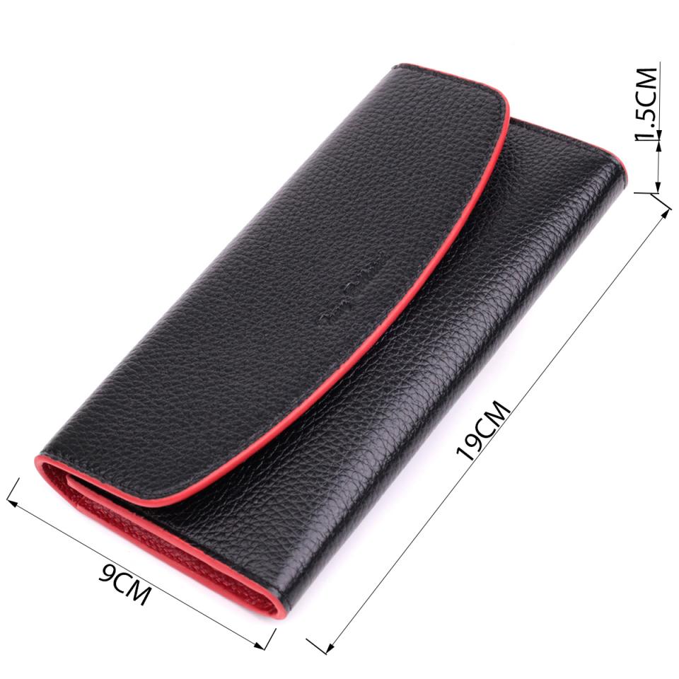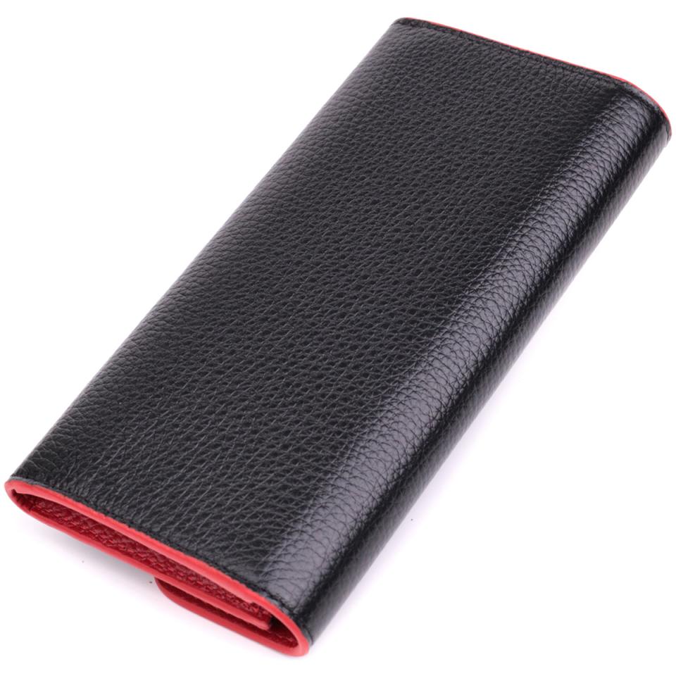 Вместительный женский кошелек из натуральной кожи, в комбинации из двух цветов черного снаружи и красного внутри. Аксессуар состоит из одного широкого отделения для купюр, двенадцати ячеек для пластиковых карт, одного прилегающего кармана и монетницы на молнии. В изделии использована качественная фурнитура золотистого цвета. Закрывается кошелек клапаном на кнопку. Покупая этот кожаный кошелек, Вы не только приобретаете стильную вещь, но и получаете качественный аксессуар, который прослужит не один год.