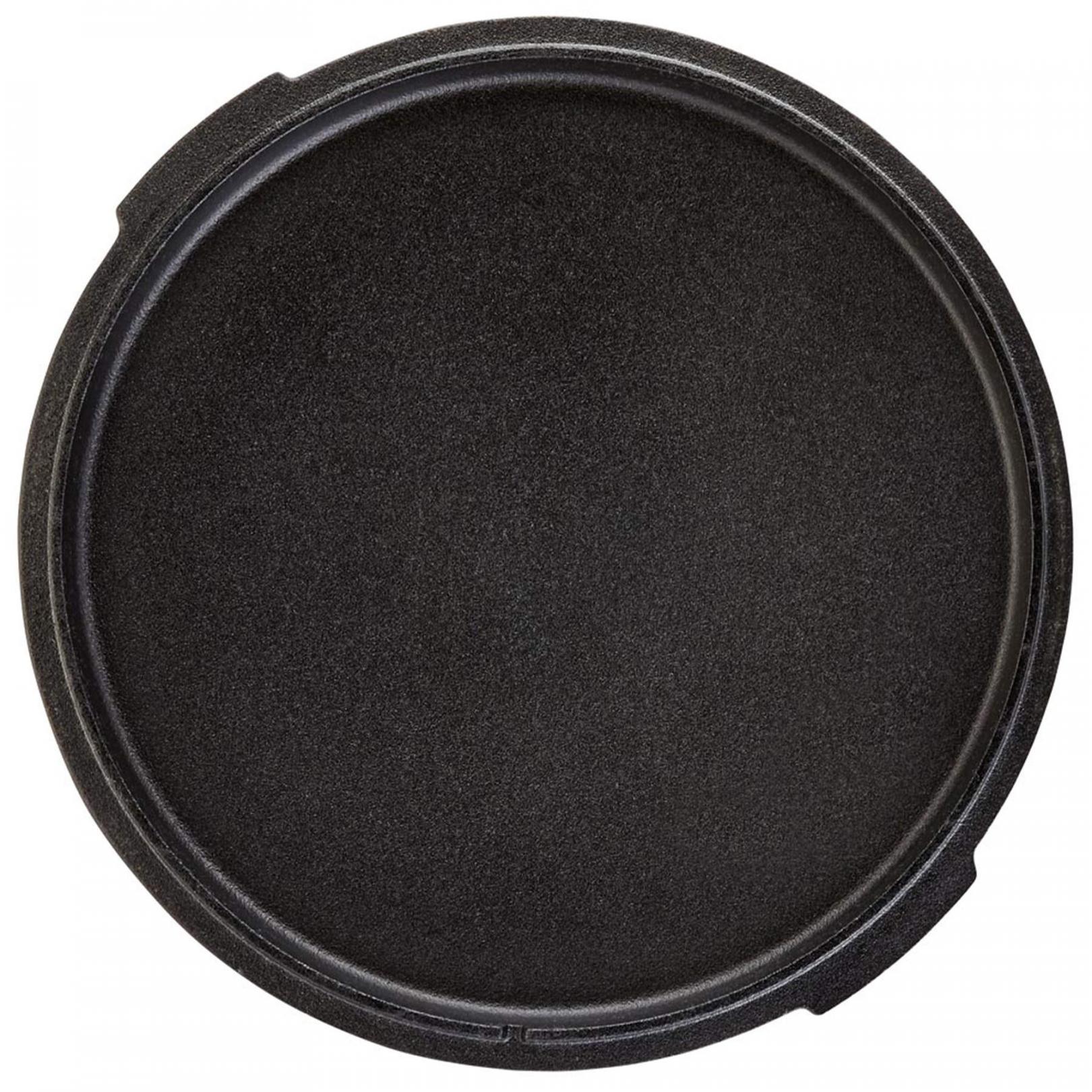 Масивна кришка із трьома ніжками виконує функцію сковорідки або сервірувальної тарілки - її зручно ставити на вугілля або стіл. Легка увігнутість кришки дозволяє конденсату рівномірно стікати до країв, не капаючи у страву при відкритті. Отвір для випуску пари запобігає перекипанню або брязканню кришки під час приготування. У нього також можна вставити термометр з виносним щупом і контролювати температуру страви.