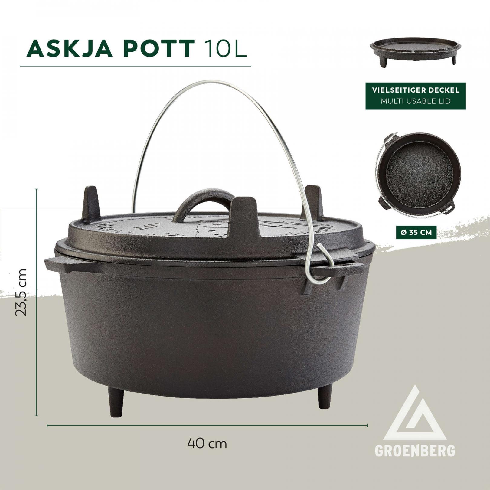 Groenberg Askja сумісний з усіма джерелами тепла: відкритий вогонь, гриль, газова чи електрична плита, духовка. Ніжки на дні забезпечують стабільне розташування на вугіллі, а кришка дозволяє накладати жар зверху для створення ефекту духовки.