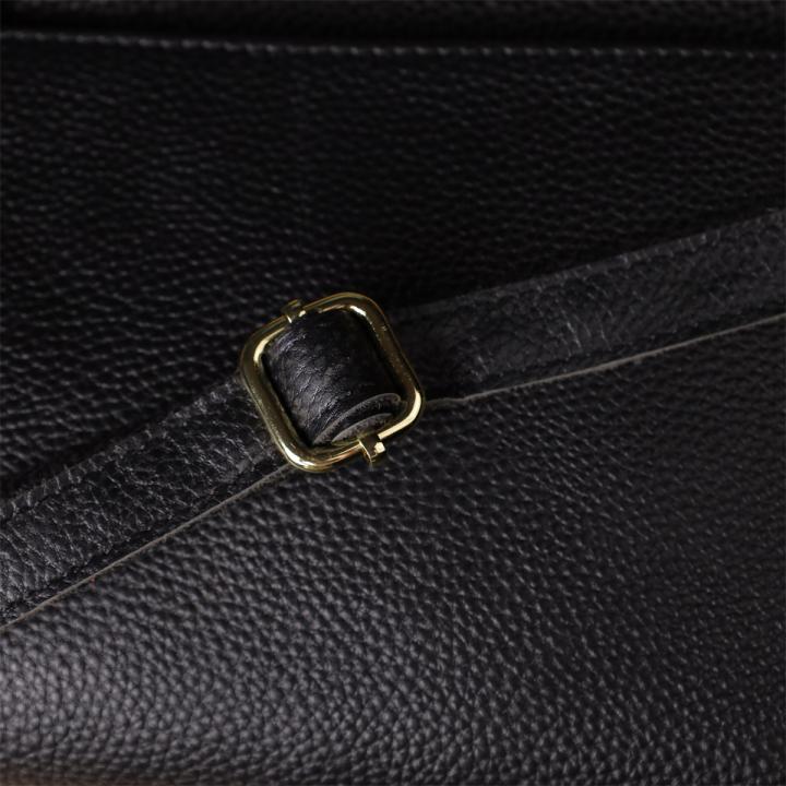 Фурнитура выполнена в тёплом цвете жёлтого золота, создающем элегантный контраст с насыщенным чёрным цветом кожи и подчёркивающем высокий уровень качества изделия.