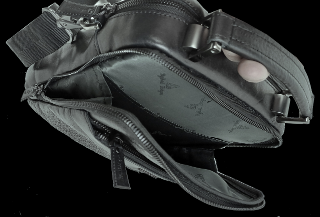 Съемный регулируемый наплечный ремень выполнен в сочетании натуральной кожи и нейлона.