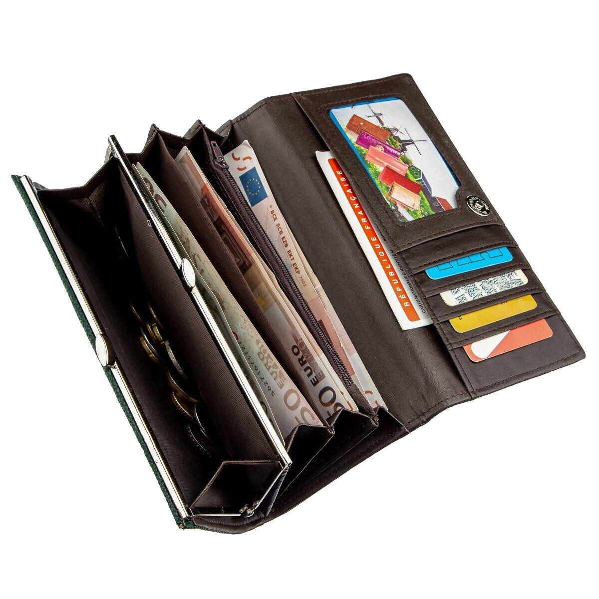 Зеленый женский кошелек из экококжи с мелким зернистым тиснением. Аксессуар очень мягкий и приятный на ощупь. Модель очень легкая. Изделие имеет представительский вид и с легкостью подчеркнет ваше индивидуальность. Внутри аксессуара подкладка в сочетании коричневой экокожи и прочного текстиля. Изделие закрывается на клапан с магнитной кнопкой. Кошелек будет прекрасным подарком для любой девушки, а цена и качество вас приятно удивят.