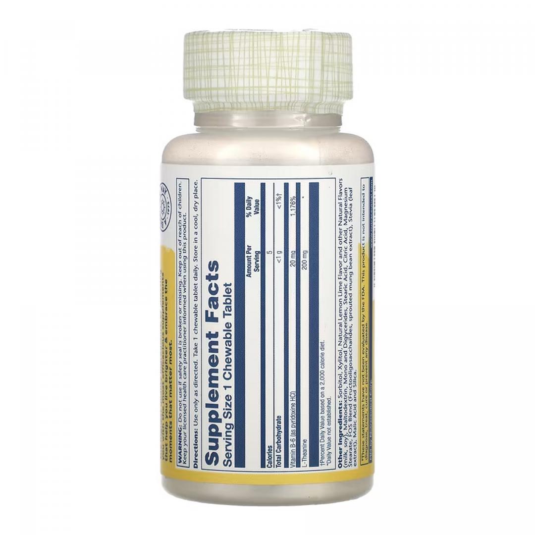 Solaray L-Theanine 200 мг – это высококачественная добавка в виде жевательных таблеток, содержащая 200 мг L-теанина, аминокислоты, естественно присутствующей в зеленом чае. Этот продукт разработан для поддержания расслабления и снижения стресса без сонливости.