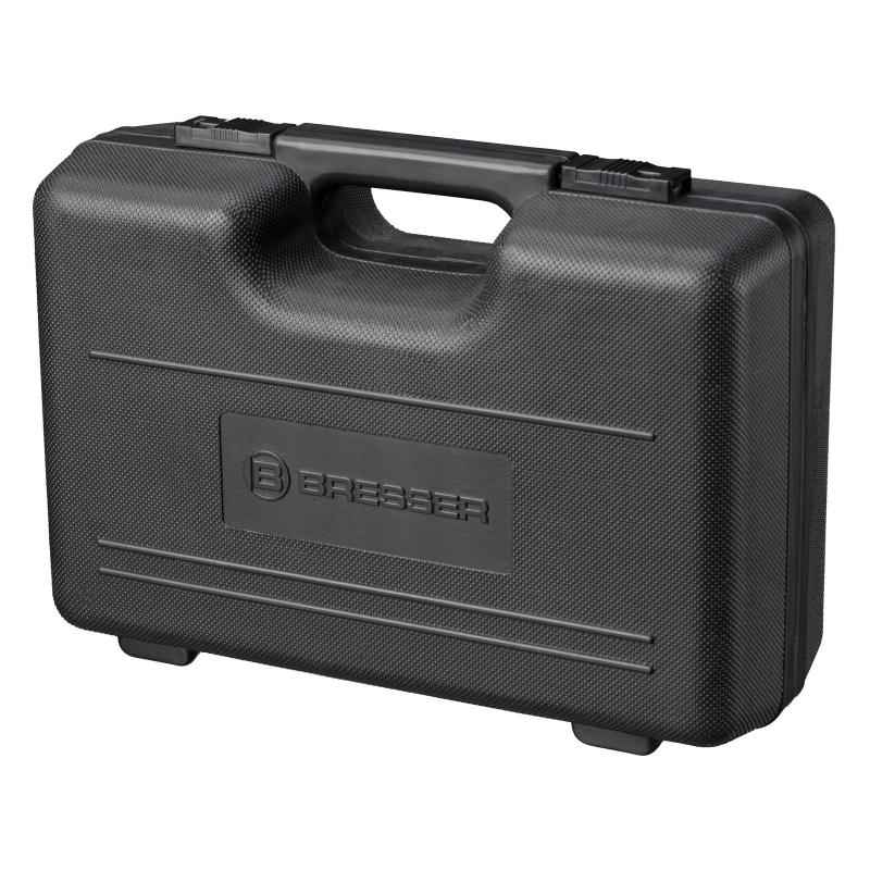 Максимум збільшення та пластиковий кейс для транспортування та зберігання виділяють цю модель з маси інших мікроскопів. Bresser Biolux SEL 40x-1600x з адаптером для смартфона + кейс (8855610GYE000) - це добре укомплектована модель бюджетного мікроскопа, забезпечена широким набором аксесуарів, а також адаптером для планшета або смартфона, який забезпечить зйомку результатів спостережень за допомогою камери Вашого портативного пристрою або спостереження зразка дисплей пристрою в реальному часі. Таким чином, мікроскоп, безумовно, буде цікавий і дітям і підліткам. Німецька компанія Bresser представляє широкий асортимент лабораторної оптики, призначеної для користувачів різного віку та навичок, починаючи від найменших і закінчуючи професійними лаборантами медичних та виробничих лабораторій. Широкий набір аксесуарів, об'єктивів і окулярів, необхідних для старту спостережень, що дає можливість відразу поринути в такий цікавий мікросвіт. Комбінація двох ширококутних окулярів та трьох об'єктивів дає можливість отримати збільшення 800х. Досить корисним та цікавим є використання у підлітковому мікроскопі лінзи Барлоу для отримання безступінчастого (плавного) зумування зображення, завдяки чому досягається максимальне збільшення 1600х. Монокулярна насадка нахилена під кутом 45°, що безумовно зручно для спостережень. Світлодіоди забезпечують підсвічування препарату світлом, що проходить і відбитим. Світло, що проходить, використовується для спостереження прозорих об'єктів, що відображає – для непрозорих тривимірних. Використання двох ламп одночасно може бути корисним при спостереженні напівпрозорих зразків. Передача кольору і інтенсивність пучка світла контролюється діафрагмою з різними діаметрами отворів і п'ятьма світлофільтрами. У комплектацію входить адаптер для смартфона (планшета). Адаптер кріпиться на тубусі мікроскопа і дозволяє проводити фото і відеозйомку головною або передньою камерою гаджета. Гладка тильна сторона смартфона надійно кріпиться за допомогою безлічі присосок адаптера (у разі рифленої тильної поверхні смартфона рекомендується використовувати передню камеру). Живлення мікроскопа здійснюється від трьох найпоширеніших батарей АА (LR6). Таким чином, мікроскоп незалежний від мережі змінного струму і може бути використаний навіть у польових умовах. Перелік аксесуарів включає готові слайди, до огляду яких можна розпочати негайно. Також у наборі є аксесуари для препарування зразків, мікротоми для самостійного приготування зразків, інкубаторій та препарати для самостійного приготування. Незважаючи на те, що даний прилад швидше буде цікавим для дітей та підлітків, всі оптичні елементи виконані зі скла, серйозне збільшення дозволить розглянути більшість з того, що доступне "дорослому" біологічному мікроскопу. Варто відзначити наявність у комплектації пластикового кейсу з ручкою, який забезпечує цілісність та збереження мікроскопа та всіх аксесуарів, як під час транспортування, так і під час тривалого зберігання.