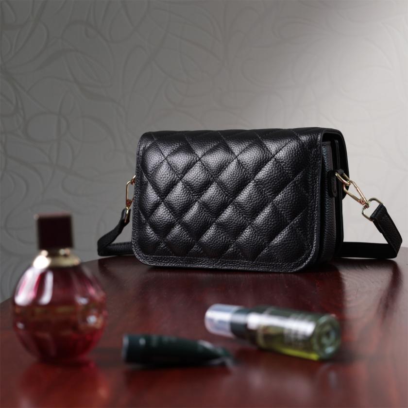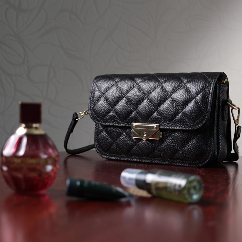 Вечерняя сумка для женщин из натуральной кожи флотар, которая неприхотлива в уходе и долго носится. Изделие полностью прошито стильными ромбами которые никогда не выходят из моды. Аксессуар состоит из основного отделения, кармана открытого типа и потайного кармана на молнии внутри, а также четырех карманов под клапаном. Носить сумку можно в руке, под рукой, на плече и через плечо, для этого имеется кожаный съемный ремень. В аксессуаре использована качественная фурнитура цвета желтого золота. Универсальный вариант сумки на вечер и на каждий день.