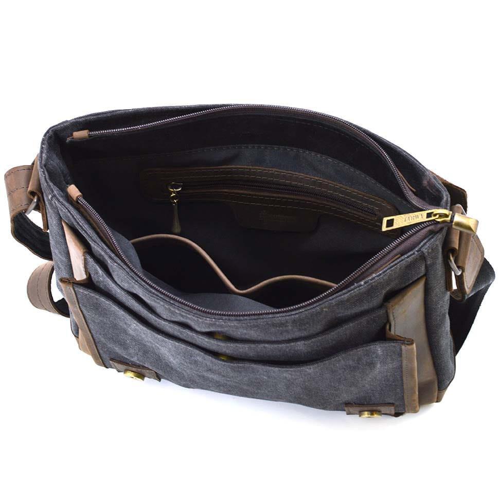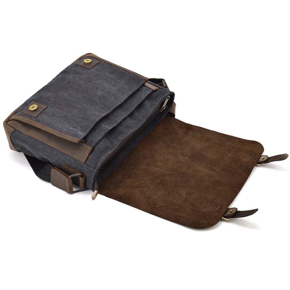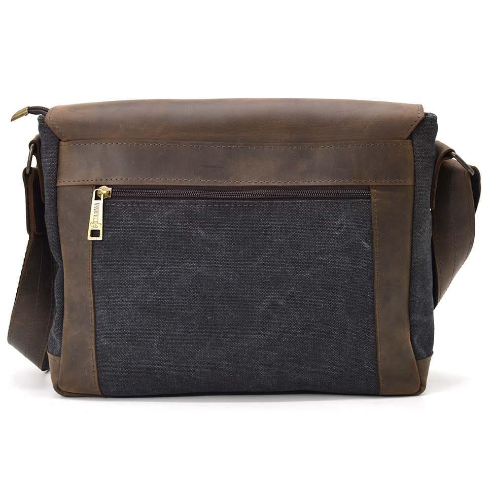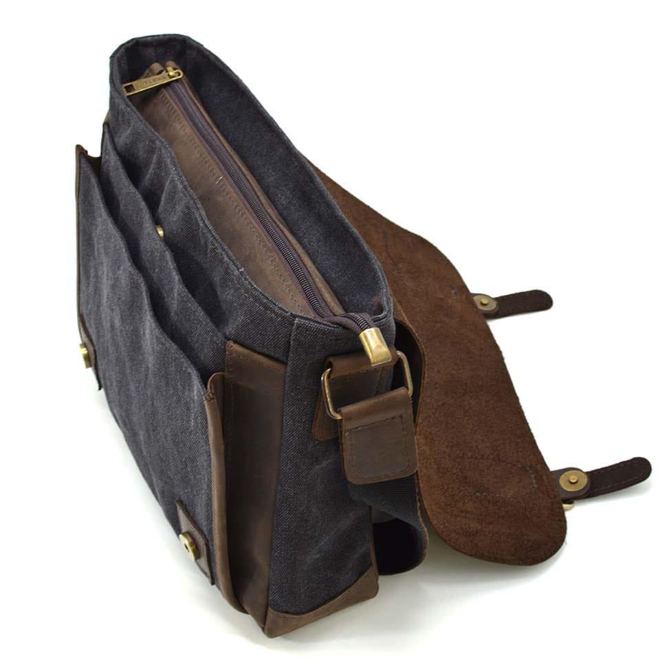 Мужская кожаная сумка через плечо из канваса и кожи TARWA, RCG-6045-3md. Оптимальный размер, два плоских кармана на лицевой поверхности под кожаным клапаном, карман на задней части сумки,