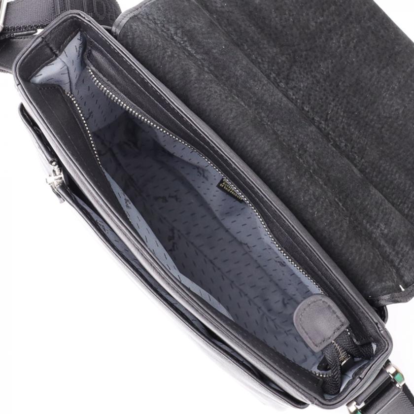 Сумка выполнена из натуральной зернистой кожи черного цвета. Оснащена одним основным отделением, которое закрывается клапаном на два магнита. Внутри расположен дополнительный карман, две ячейки для ручек и потайной карман на молнии. Снаружи – карман на молнии на клапане, а также карман на молнии на тыльной стороне. Дополнена прочным брендированным текстильным ремнем, который делает использование удобным и подчеркивает оригинальность изделия.