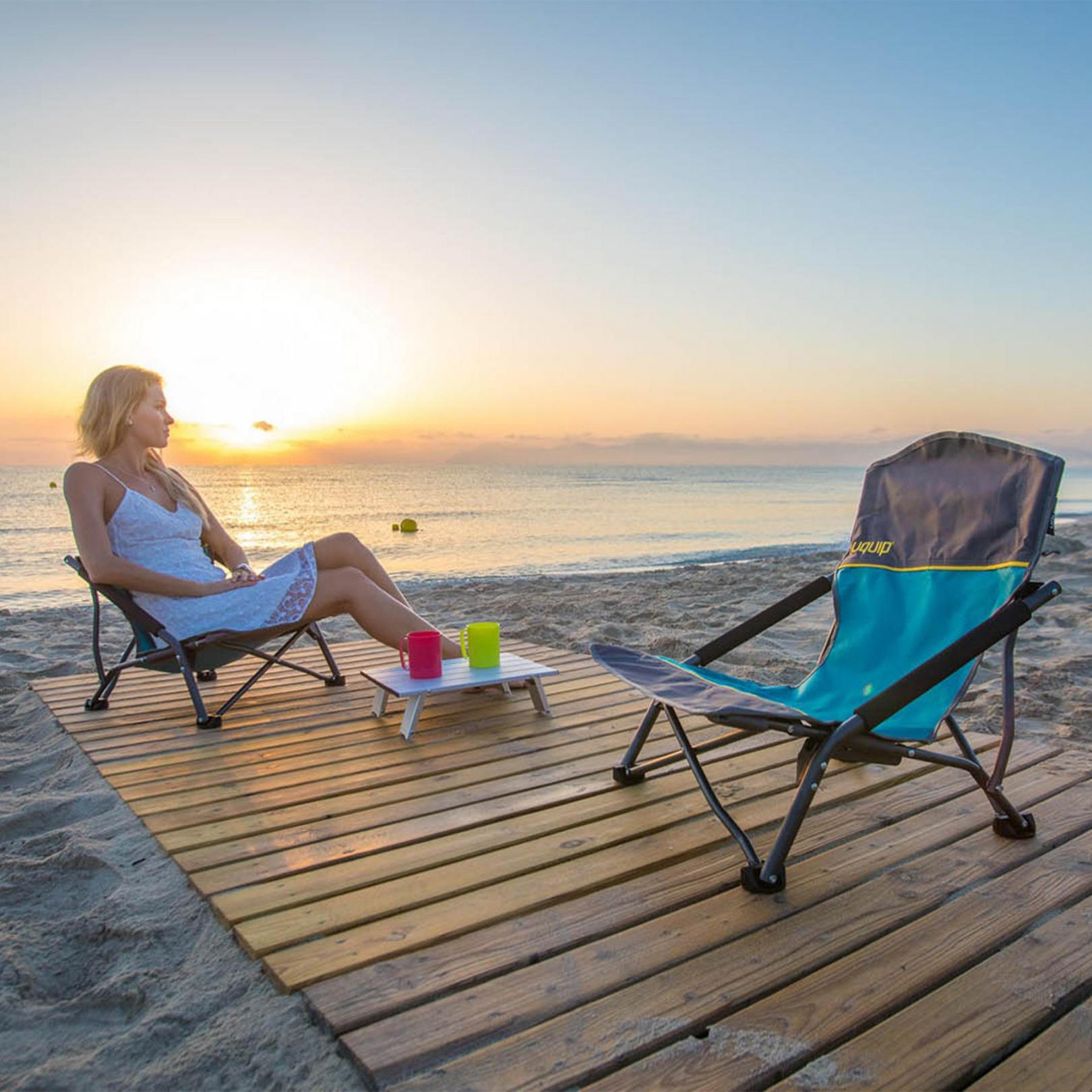 Пара пляжних крісел з низькою посадкою Uquip Sandy чудово підійдуть для відпочинку не лише на пляжі, але й в кемпінгу, на пікніку чи у дворі власного будинку. Попередньо вигнуті елементи каркасу забезпечують компактність в зібраному вигляді і стійкість крісла одночасно.