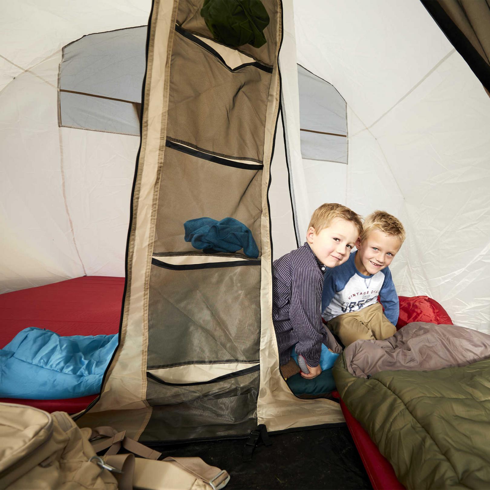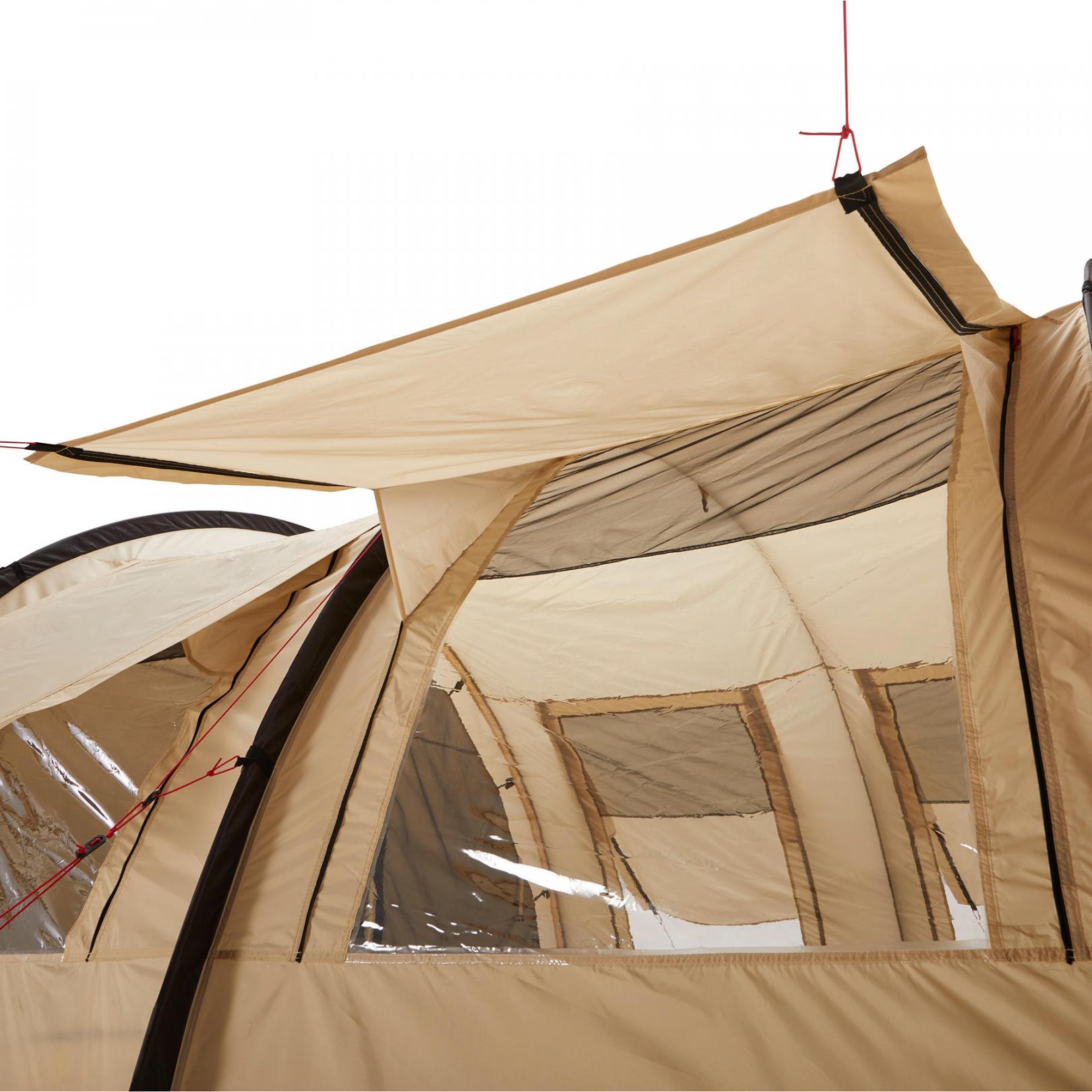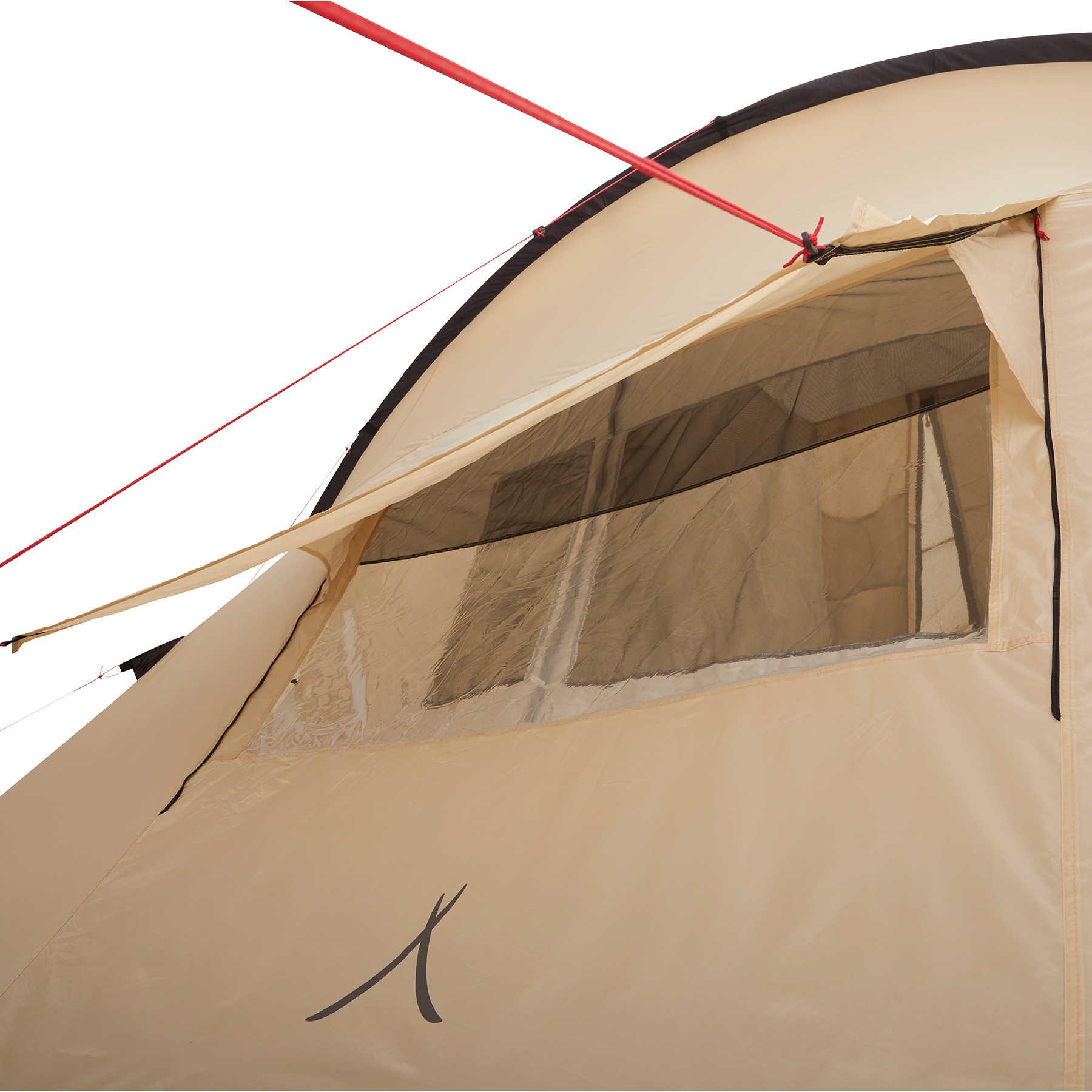 - Двері внутрішнього намету мають як шторку з тканини, так і вбудовану москітну сітку, кожна з яких оснащена окремою блискавкою. Це дозволяє регулювати рівень вентиляції та температуру всередині намету.