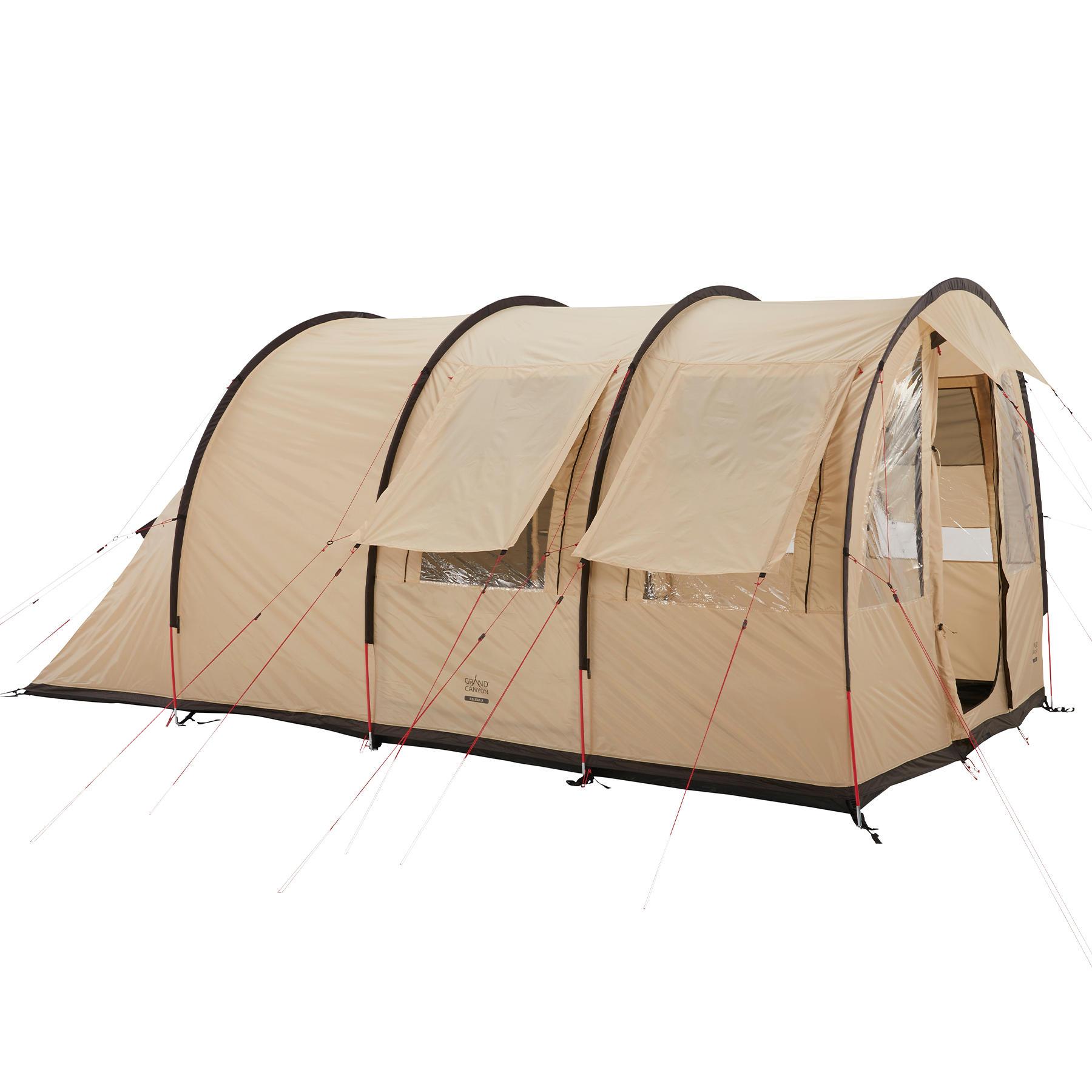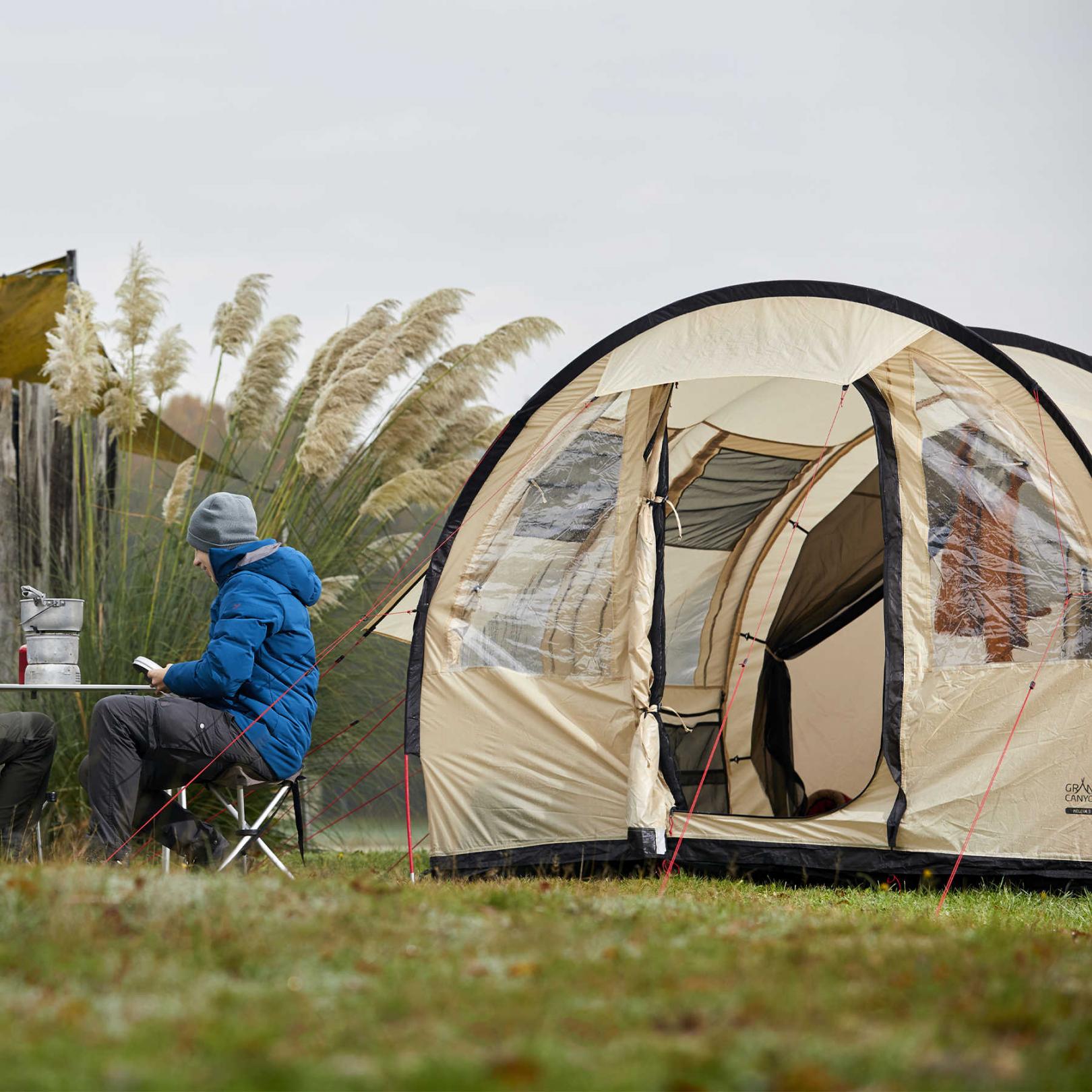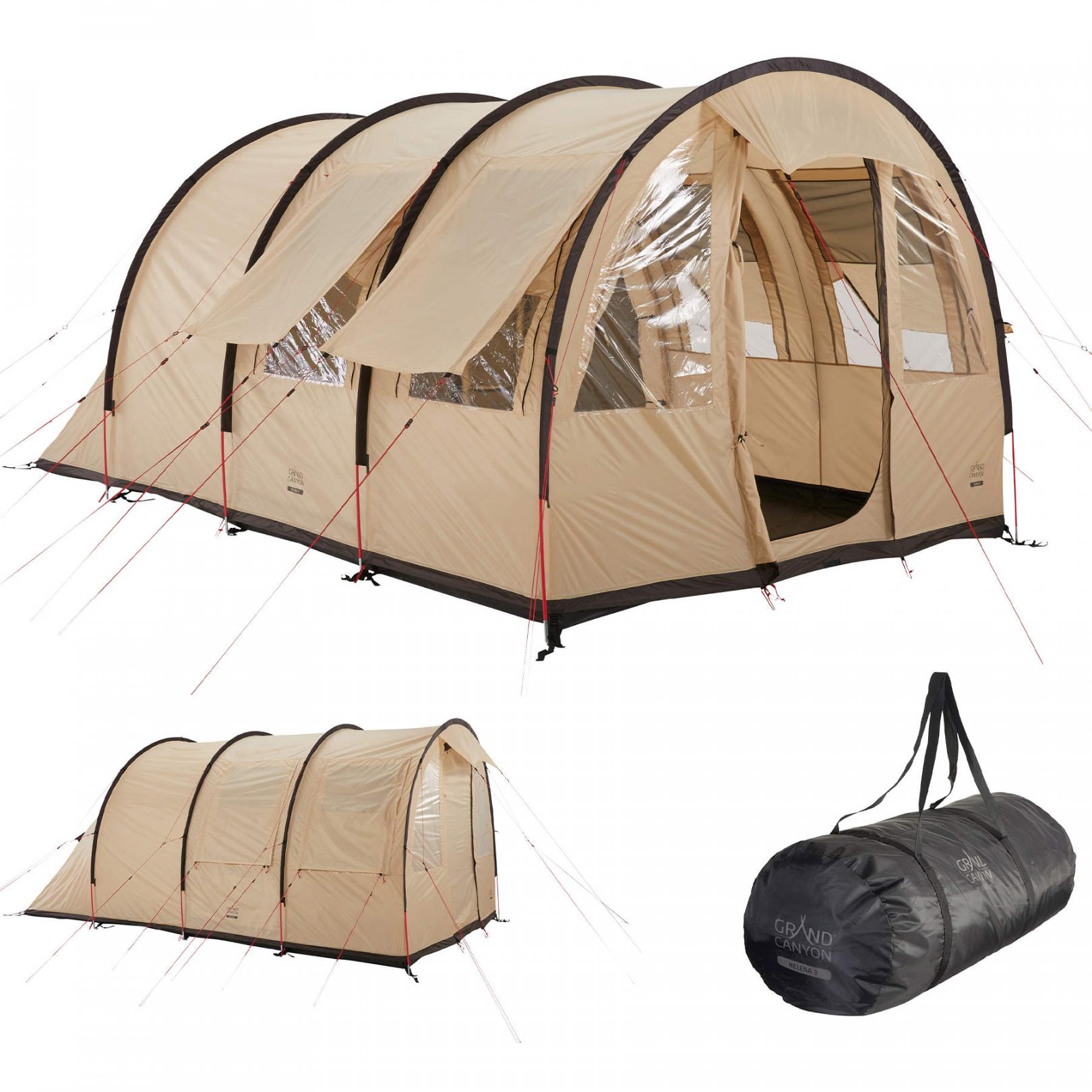 Двохшарова конструкція, поліуретанове просочення зовнішнього шару підлоги та проклеєні шви забезпечують водостійкість 4000 мм водяного стовпа, що дозволяє не боятись проникнення вологи навіть під час затяжних опадів. Першочергово встановлюється зовнішній тент, а потім до нього приєднується внутрішній намет, що дозволить зберегти внутрішній намет сухим навіть під час встановлення намету під дощем. Світлий бежевий колір дозволяє намету менше нагріватись під променями літнього сонця. Числені конструктивні дрібнички, такі як органайзери з кишенями, окремий отвір для прокладення електричного кабелю в намет, навіси над входом і вікнами роблять намет Grand Canyon Helena 3 одним з найзручніших тунельних наметів для кемпінгу.