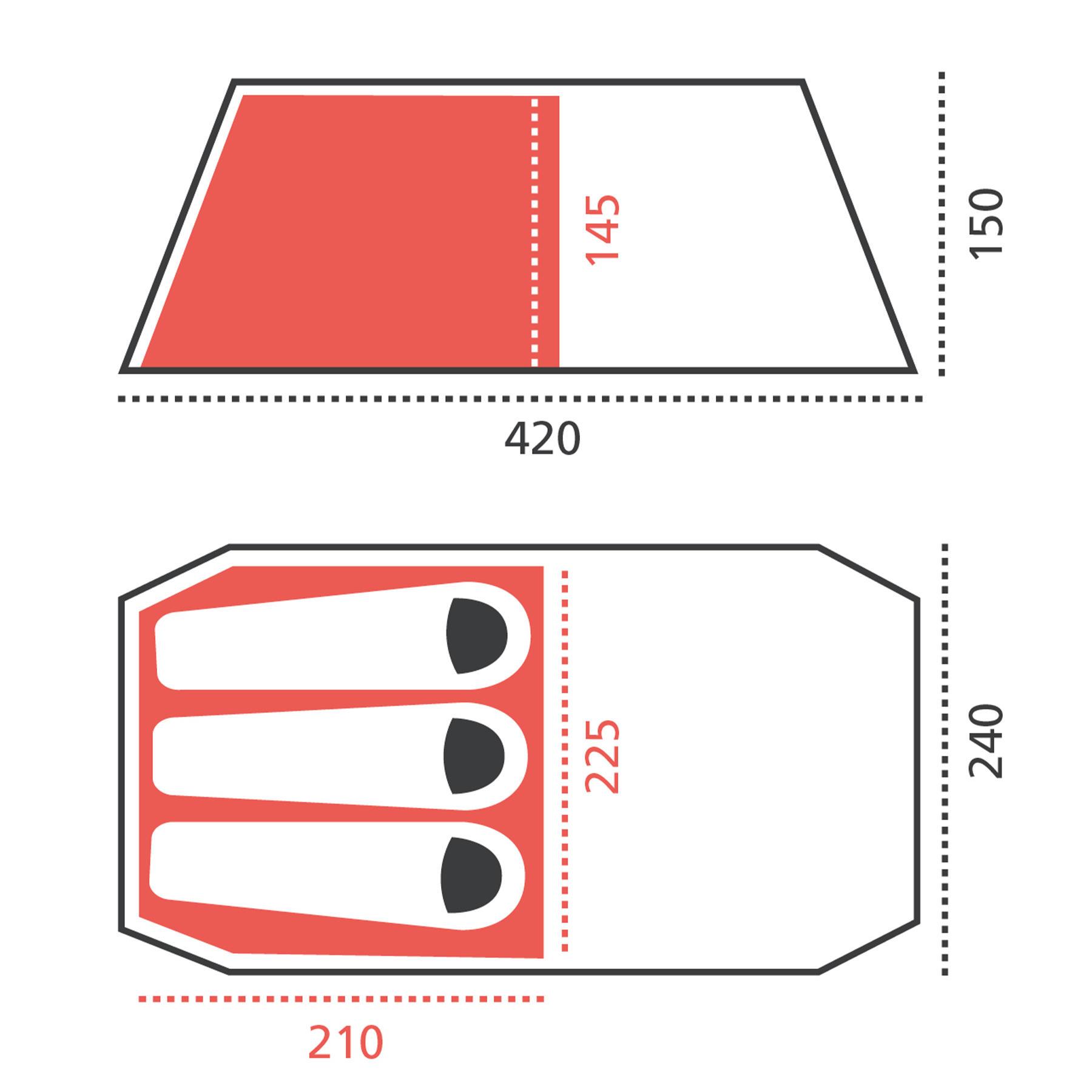 - Зовнішній намет (Д х Ш х В): 420 х 240 х 150 см