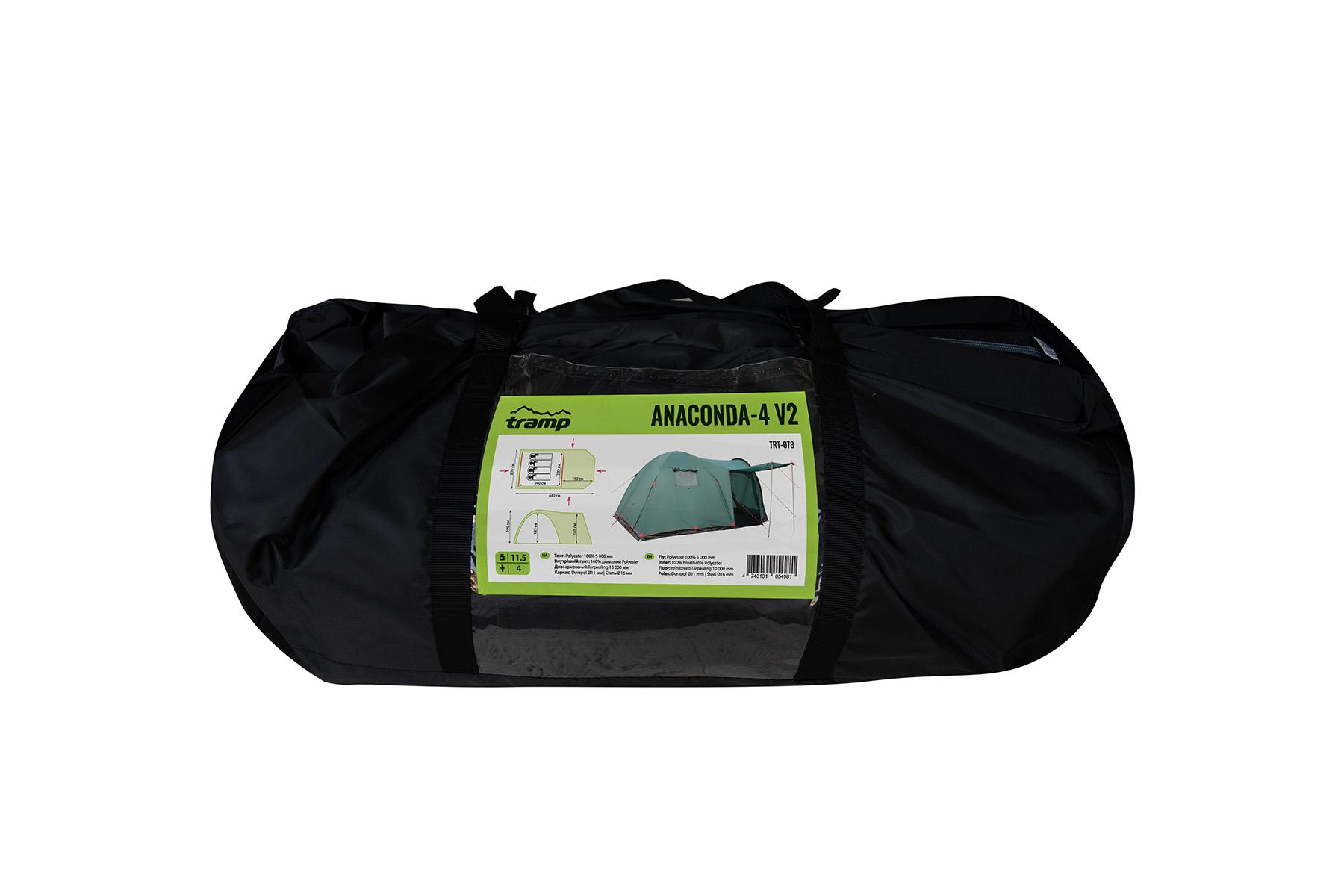Tramp Anaconda 4 (V2) - вместительная четырехместная кемпинговая палатка для отдыха на природе с отличной вентиляцией. Оборудована 4 входами – один из торцевой задней стенки и 3 из тамбура. Увеличенный тамбур позволяет удобно разместить мебель и принадлежности.