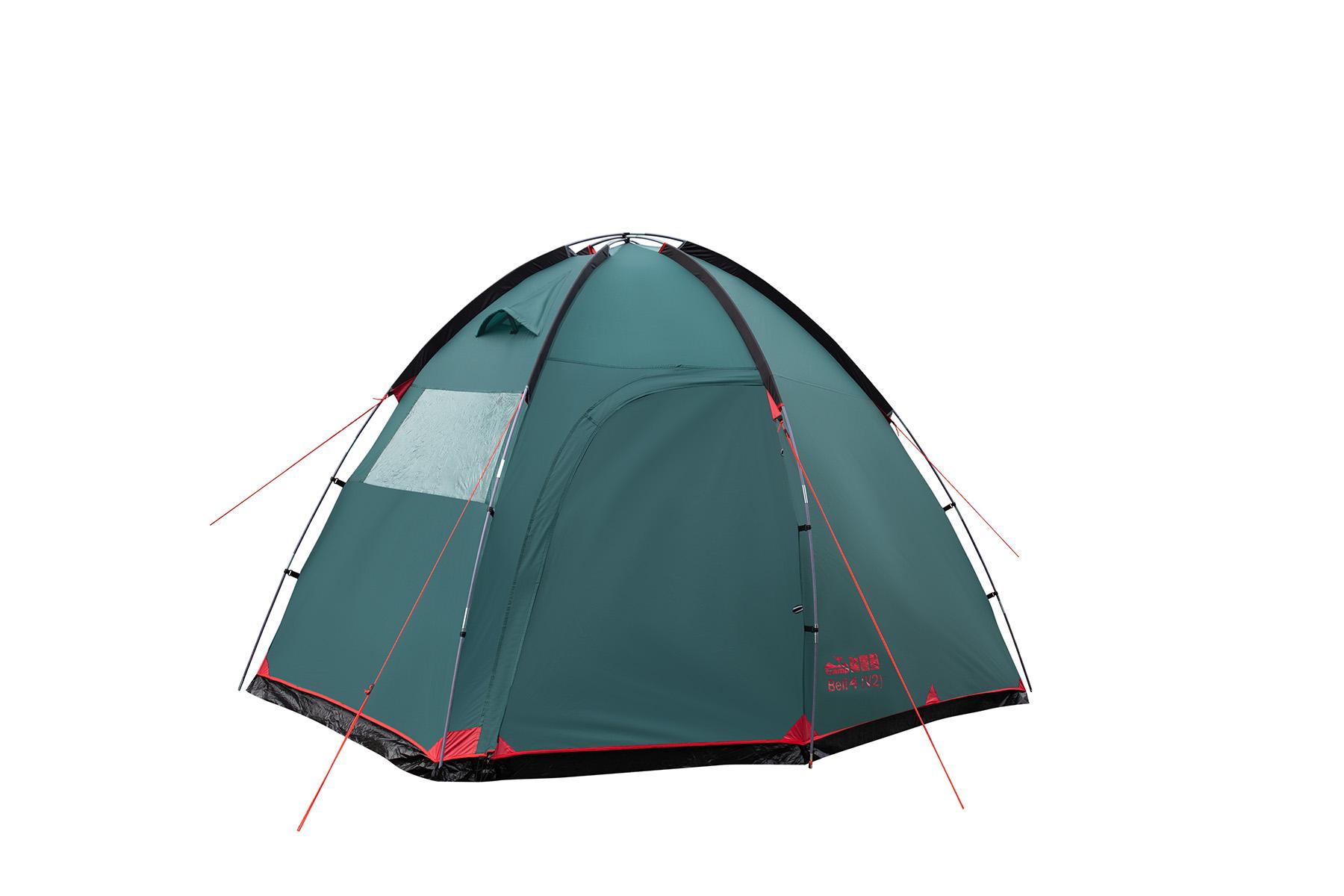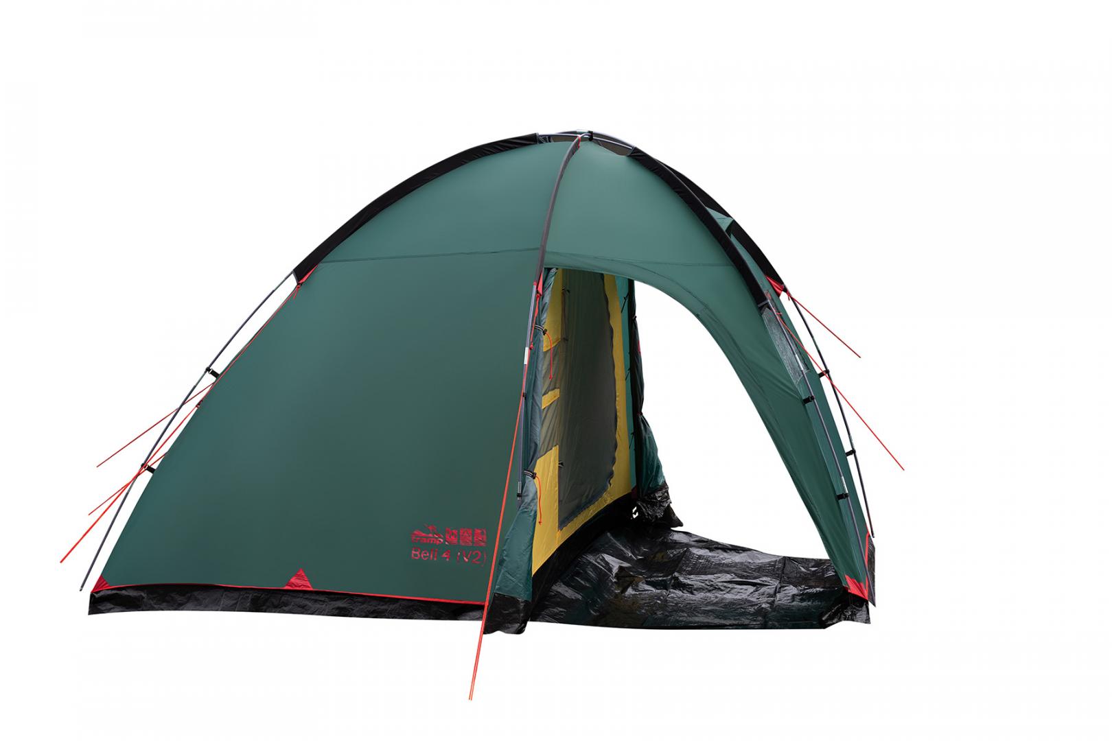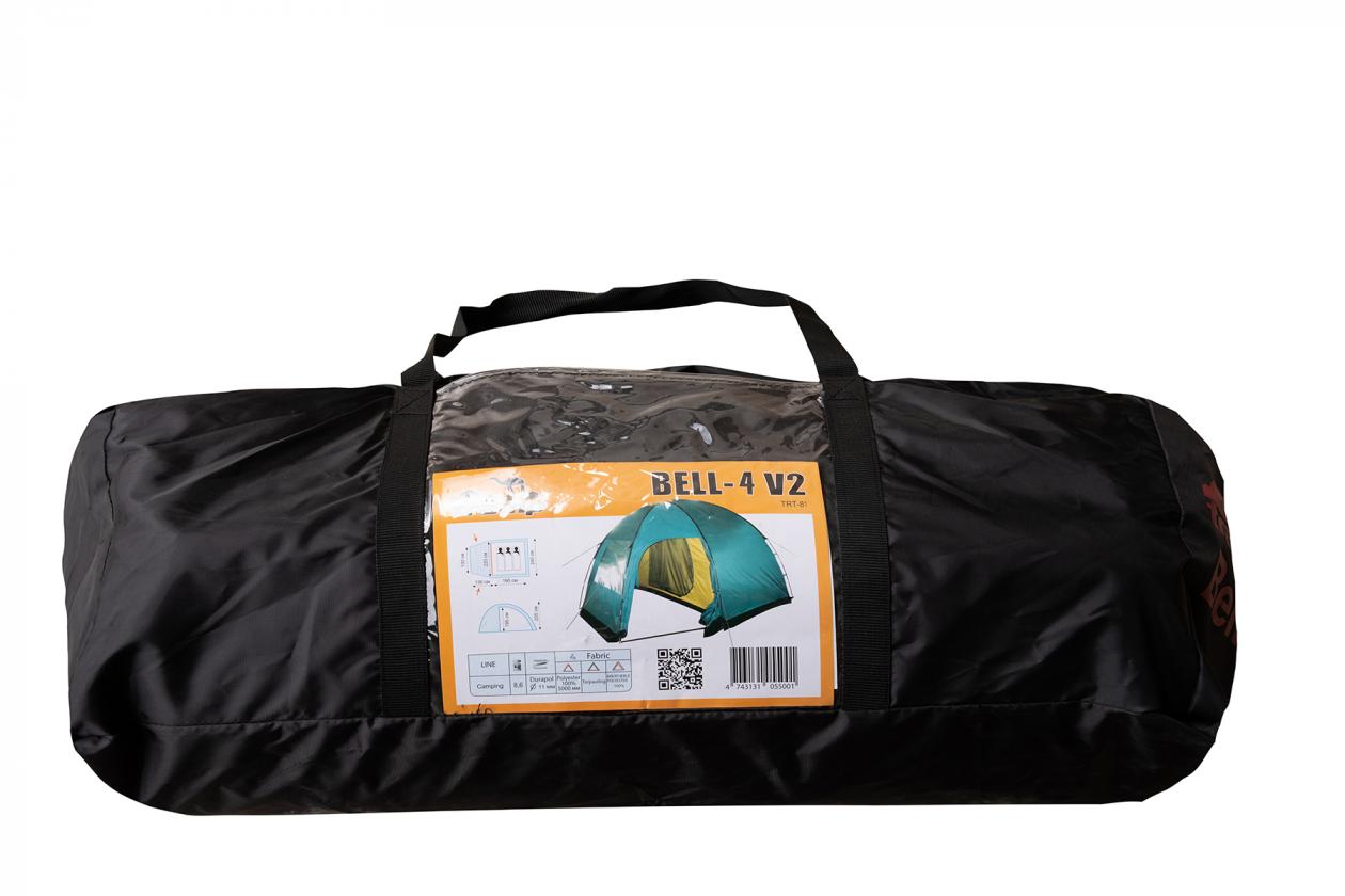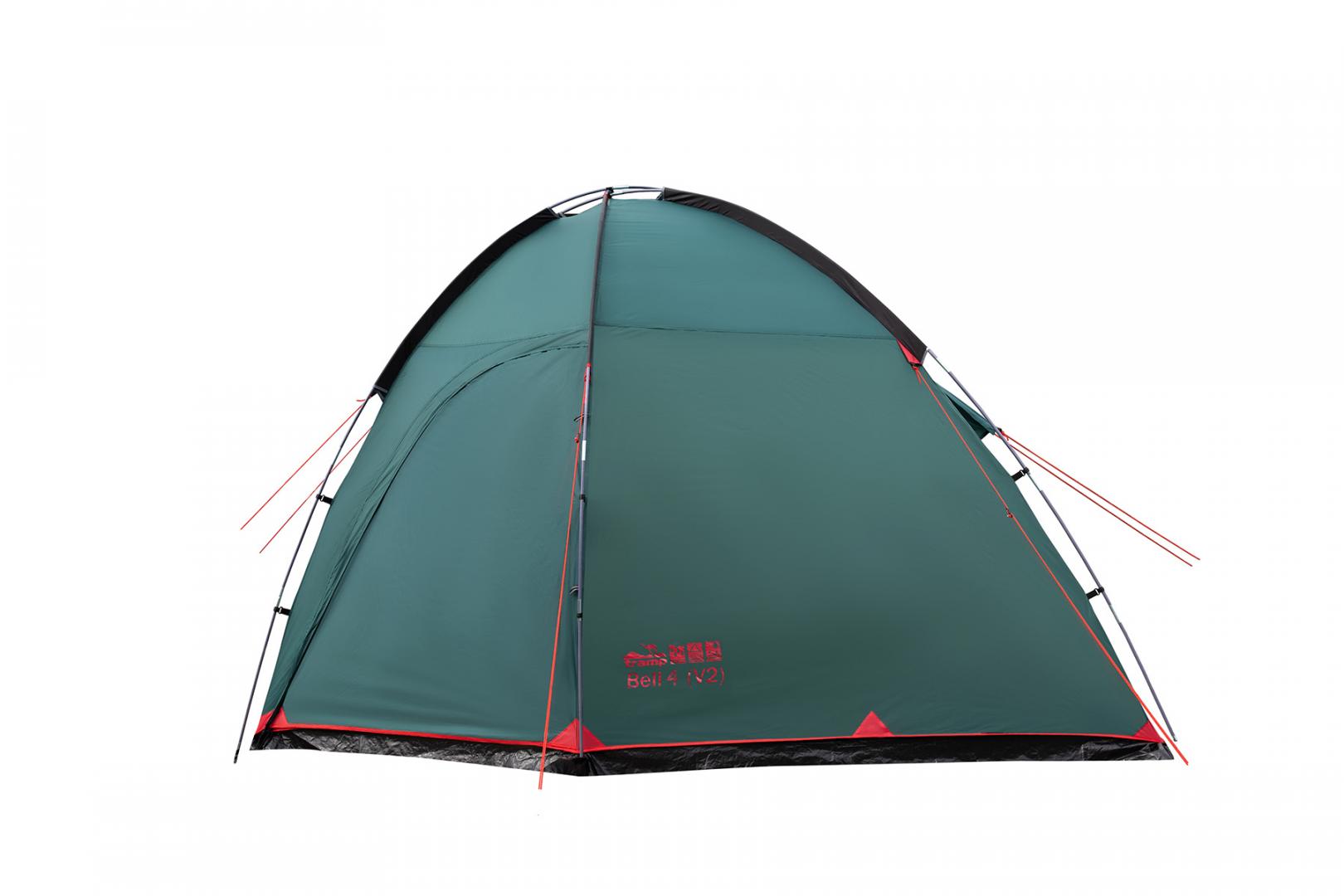 Tramp Bell 4 (V2) - четырехместная кемпинговая палатка для отдыха на природе. Оснащена высоким просторным тамбуром с 2 входами и смотровым окном в торцевой стенке. Внешние дуги позволяют комфортно устанавливать и складывать палатку под дождем, а также использовать ее как отдельный павильон или кухню.