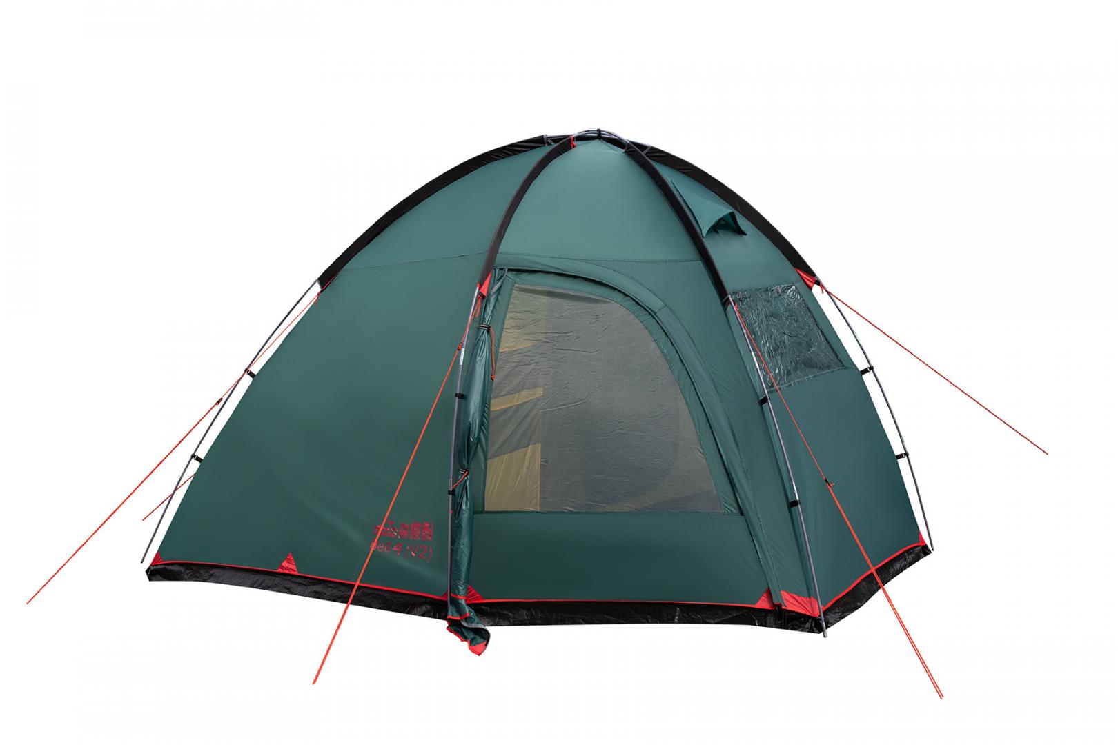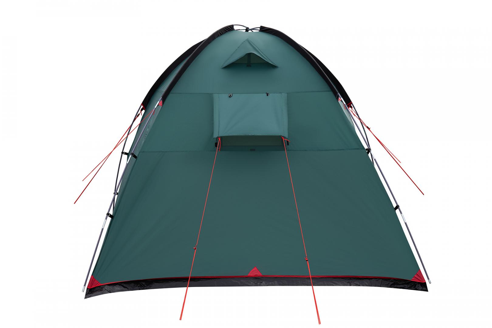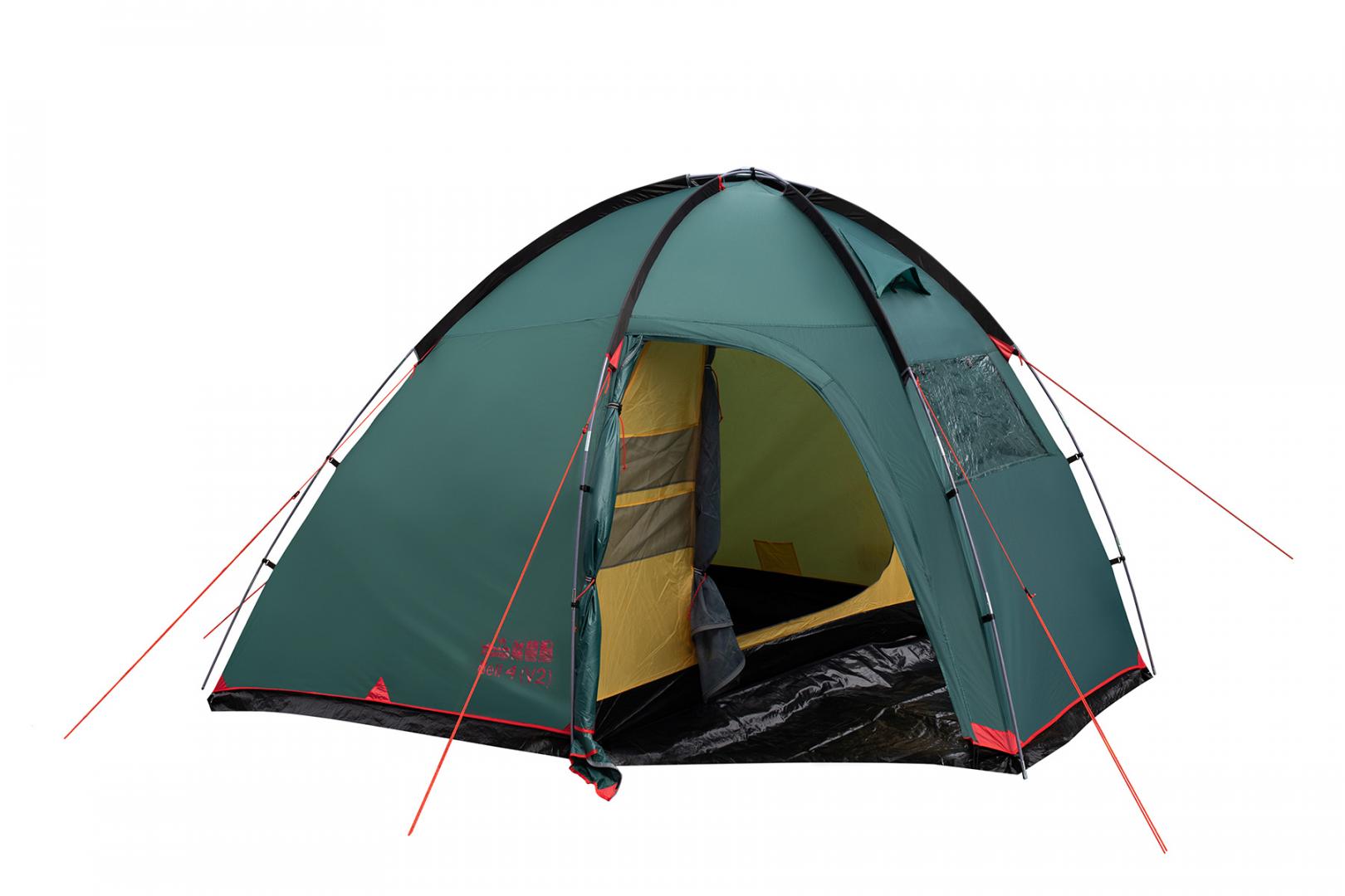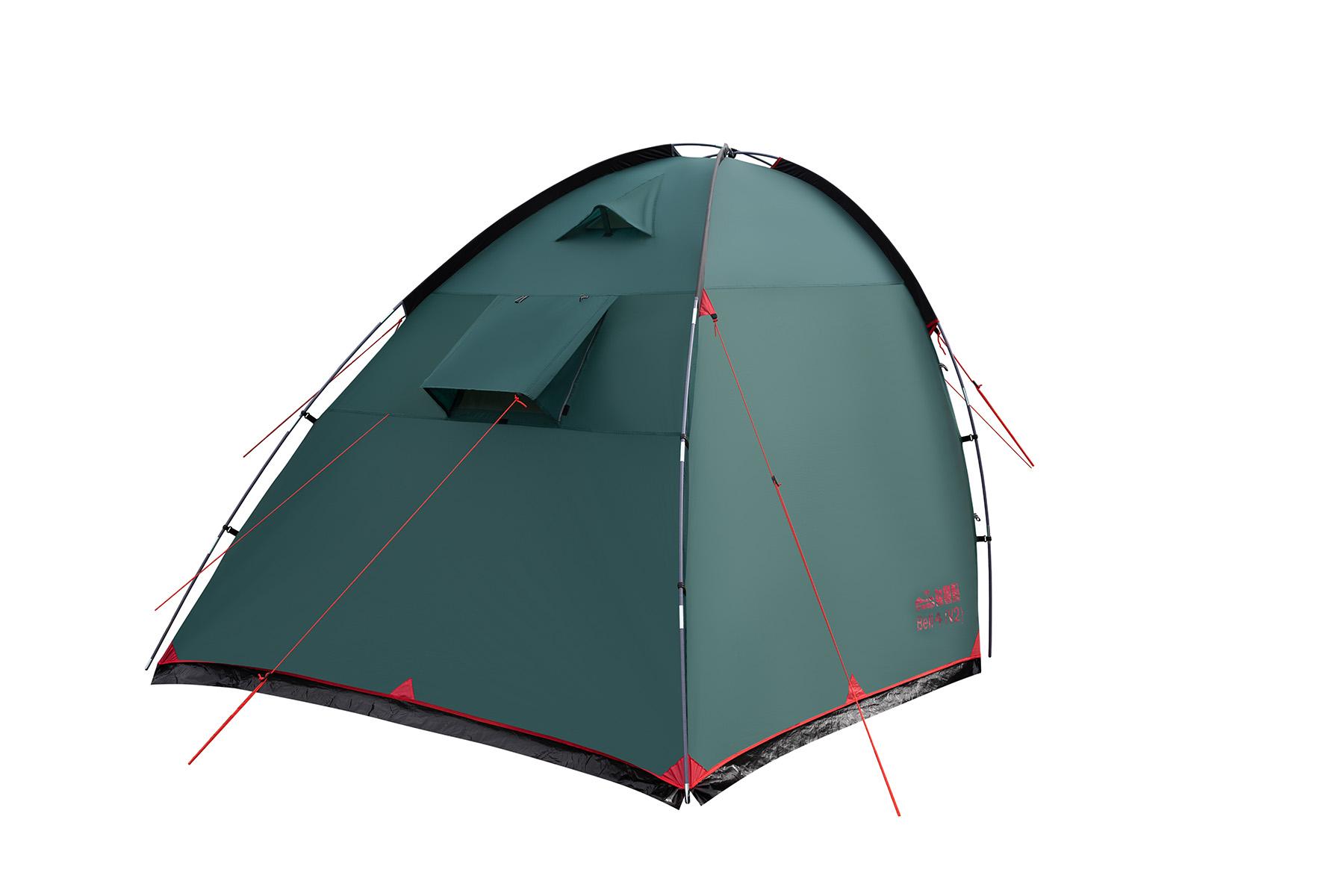 Tramp Bell 4 (V2) - четырехместная кемпинговая палатка для отдыха на природе. Оснащена высоким просторным тамбуром с 2 входами и смотровым окном в торцевой стенке. Внешние дуги позволяют комфортно устанавливать и складывать палатку под дождем, а также использовать ее как отдельный павильон или кухню.