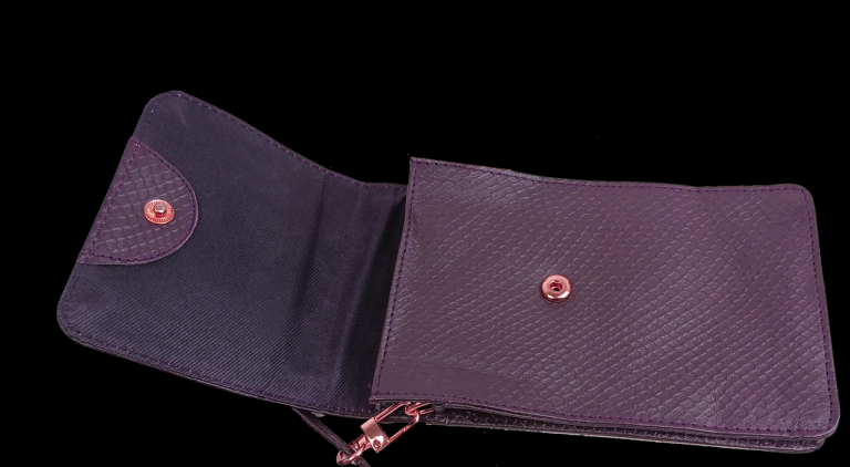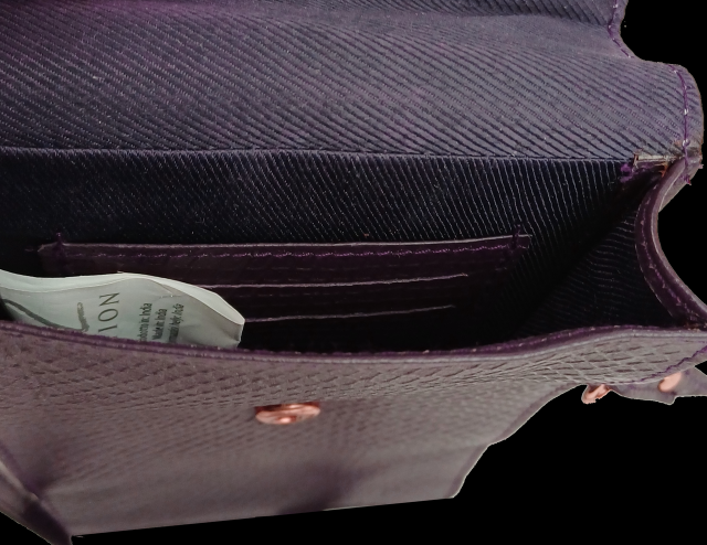 Одно основное отделение, которое закрывается клапаном на механической кнопке. Внутри расположено три маленьких кармашка для визиток или платежных карт.