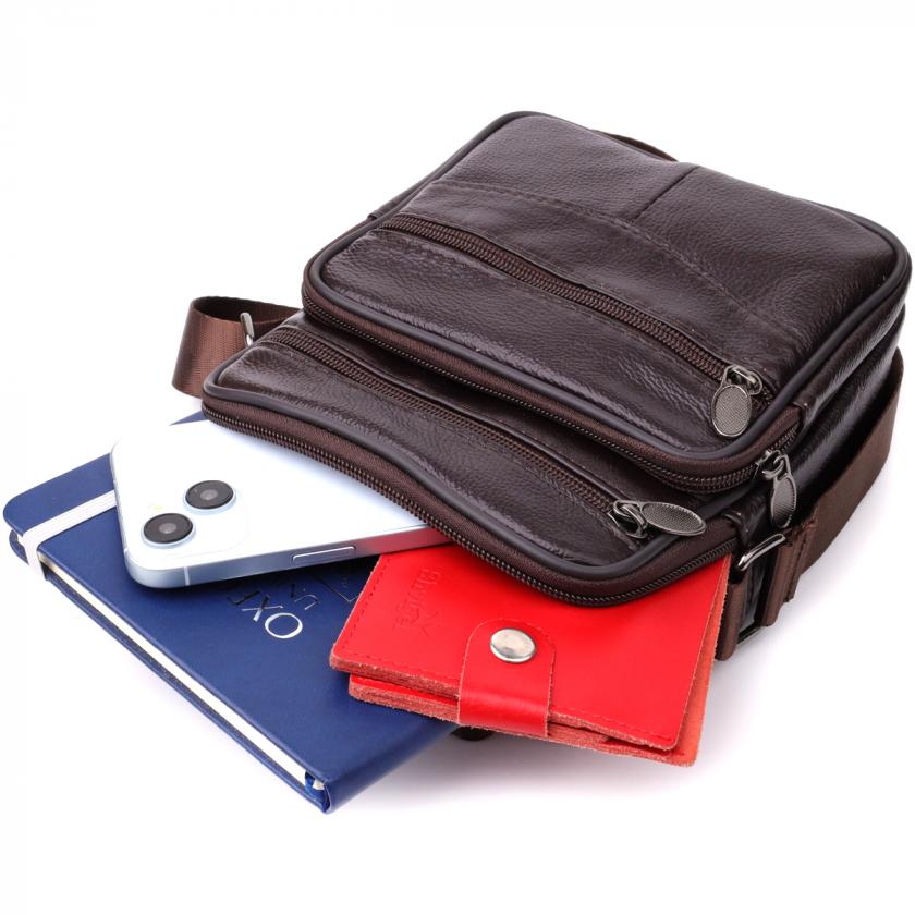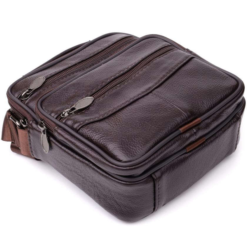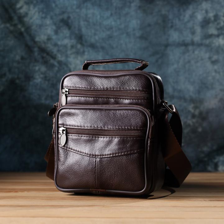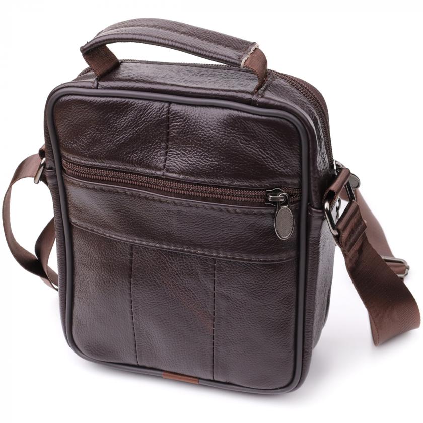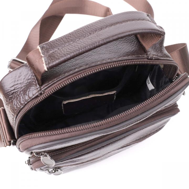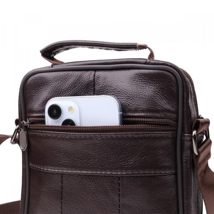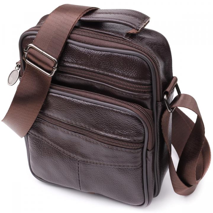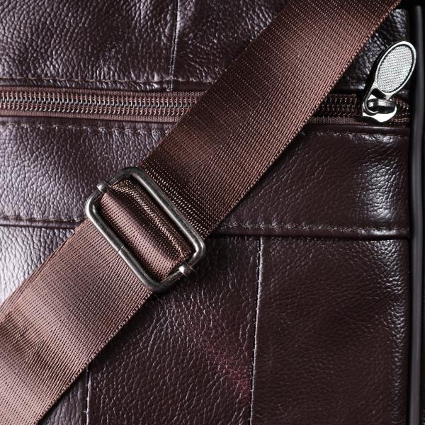 Удобная мужская сумка из высококачественной натуральной кожи, устойчивая к износу и мелким повреждениям. Модель оснащена одним вместительным основным отделением и четырьмя дополнительными карманами, которые обеспечивают удобное хранение аксессуаров, документов, телефона и других необходимых вещей. Регулируемый плечевой ремень выполнен из прочного текстиля, что гарантирует комфорт при носке, а также позволяет подобрать оптимальную длину. Короткая ручка делает сумку удобной для переноски в руке. Красивый коричневый цвет придаёт модели универсальности и стиля, делая её отличным выбором на каждый день — как для деловых встреч, так и для повседневного использования.