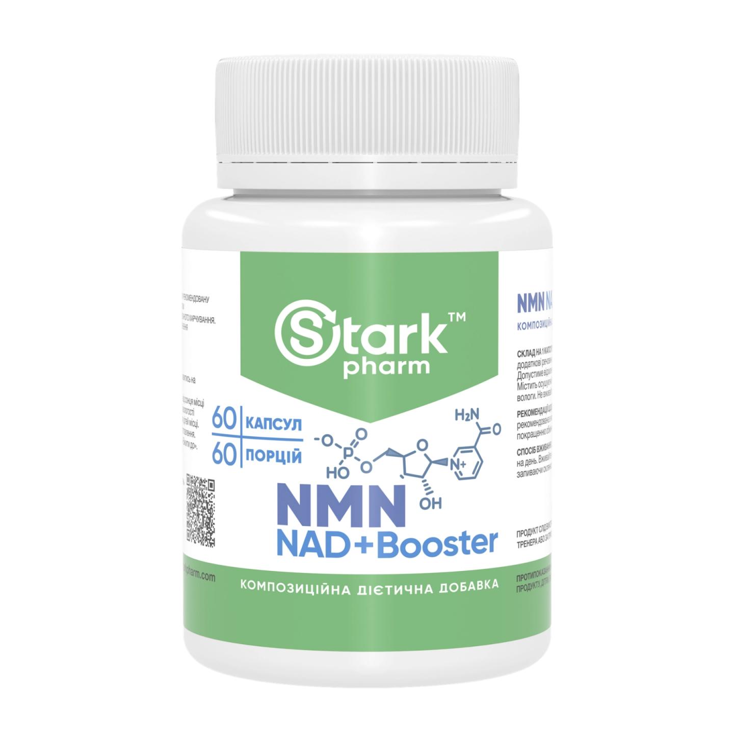 Пищевая добавка Stark Pharm – Stark NMN NAD+ Booster содержит никотинамиду мононуклеотид, являющееся соединением, которое необходимо нашему организму для выработки NAD+. Именно НАД+ участвует в клеточном дыхании и отвечает за метаболическое производство энергии, помогая восстанавливать повреждения в цепях ДНК.
