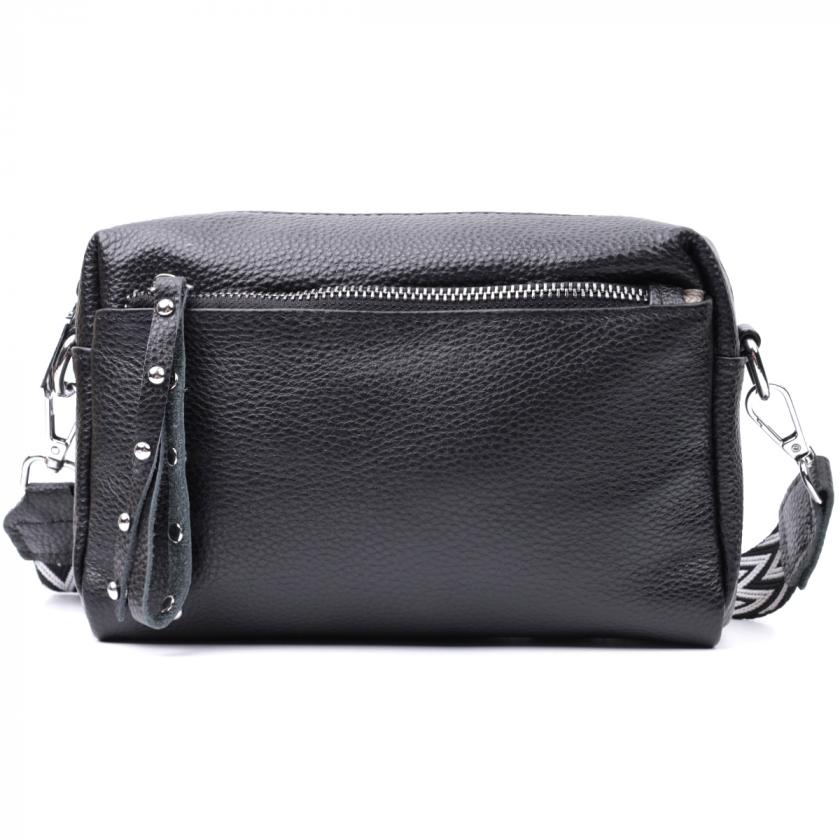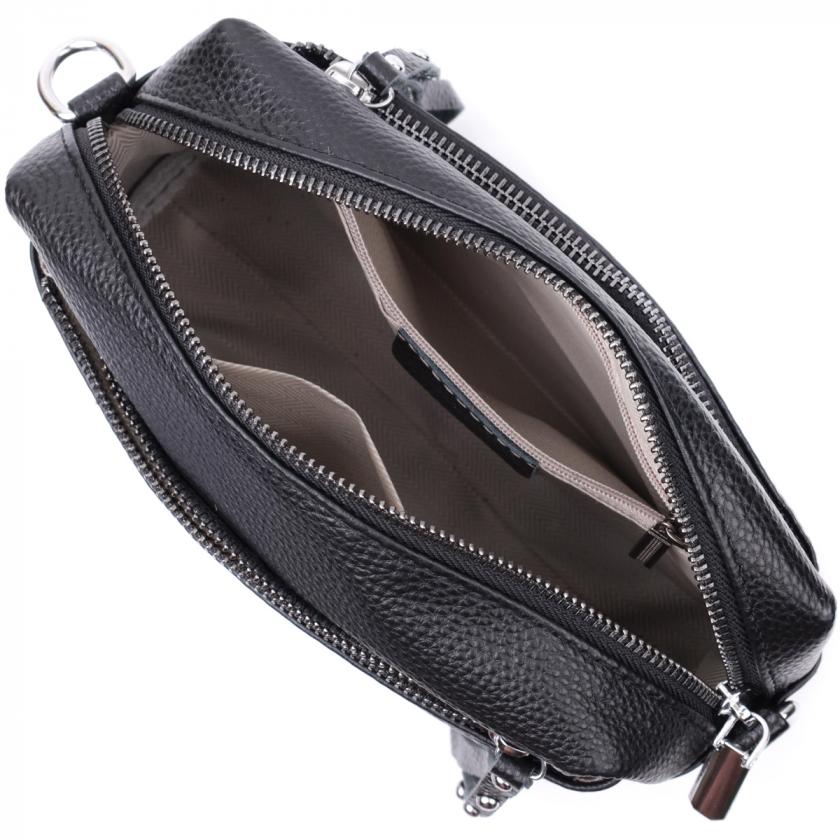 Практичная женская сумка в классическом черном цвете из натуральной кожи. Аксессуар состоит из основного отделения, что закрывается на молнию, кармана на молнии и кармана открытого типа внутри, двух карманов на молниях снаружи, на тыльной и лицевой стороне. Носить сумку можно на плече и через плечо, для этого имеется съемный текстильный ремень.