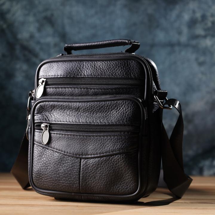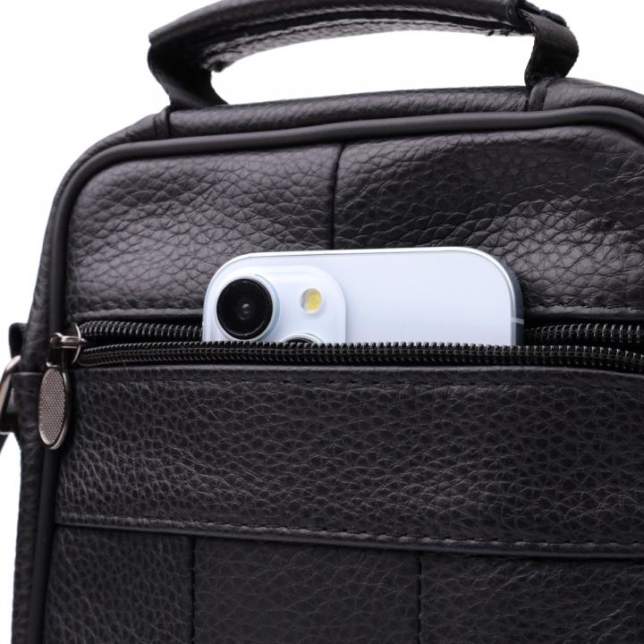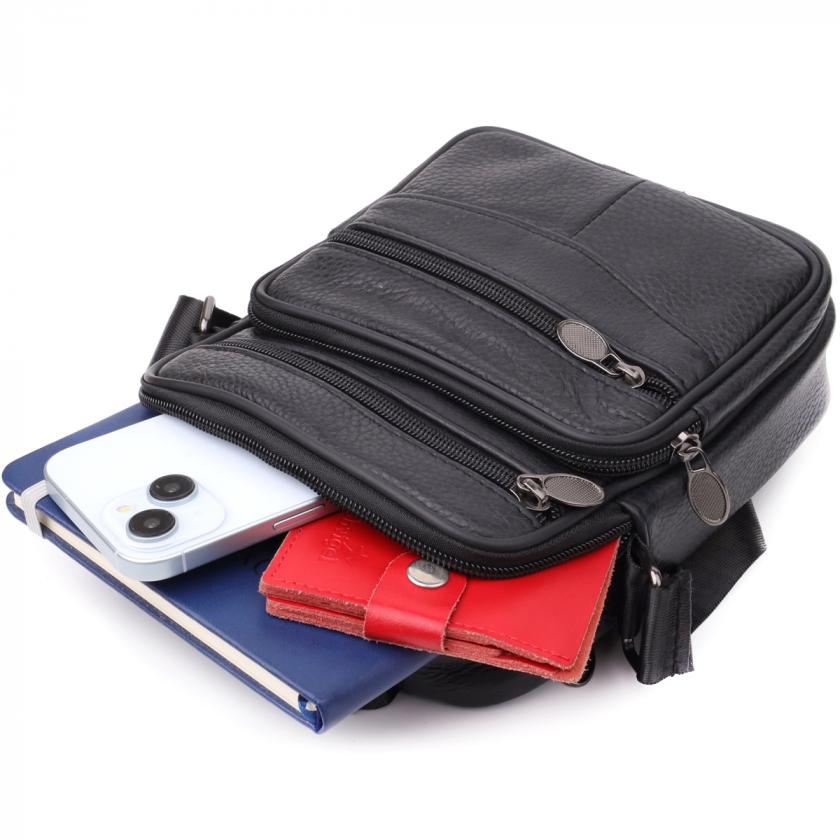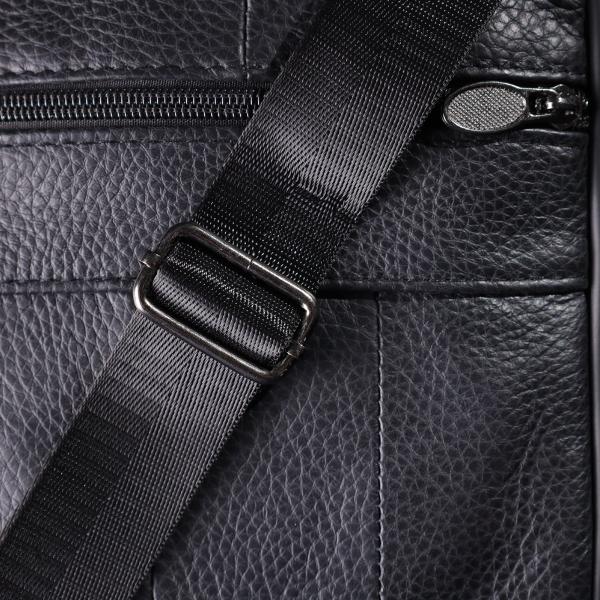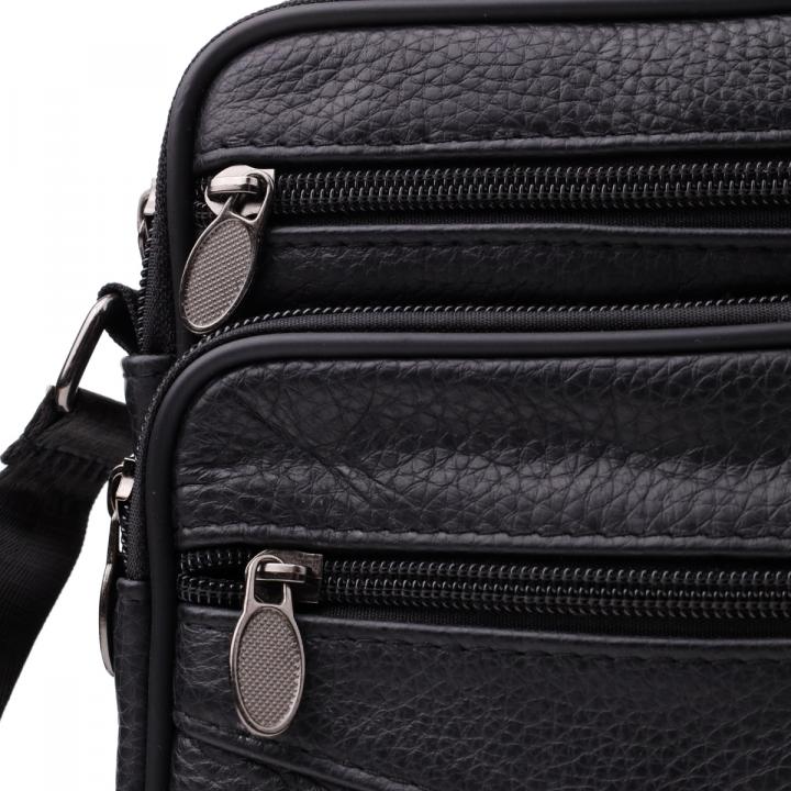 Компактная мужская сумка из высококачественной натуральной кожи, которая устойчива к различным повреждениям и износу. Имеет одно основное отделения и четыре дополнительных кармана для различных аксессуаров. Ремень выполнен из прочного текстиля и регулируется по длине. Классический чёрный цвет дополняет практичность модели и делает её отличным выбором на каждый день.