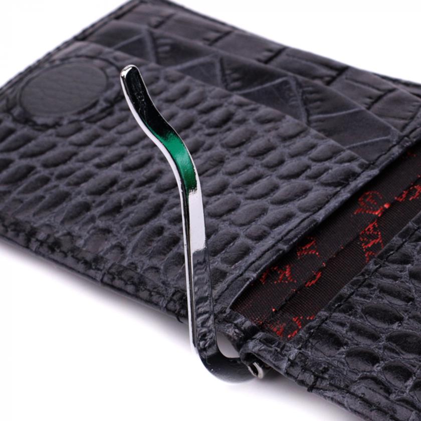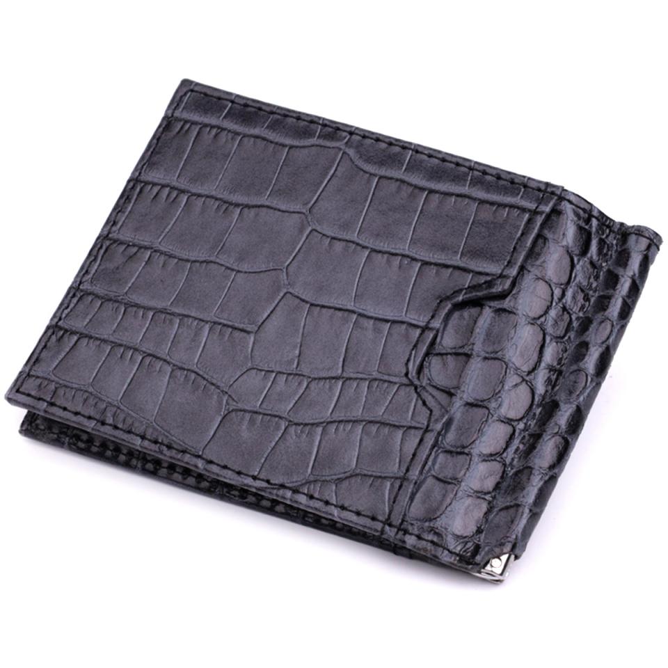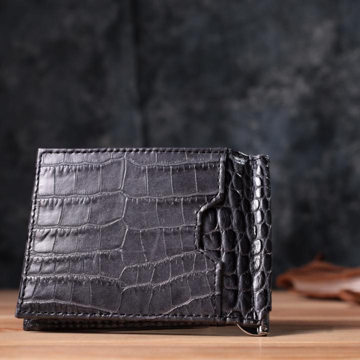 Стильный кошелек-зажим для купюр выполнен из фактурной натуральной кожи с тиснением под крокодила. Аксессуар выполнен в стильном сером цвете. Купюры фиксируются металлическим держателем. Польза зажима состоит в том, что он намного компактнее, чем кошелек, легко помещается в руку или карман. Аксессуар упакован в фирменную коробочку. Изделия из натуральной кожи всегда будут отличным подарком для близкого человека.