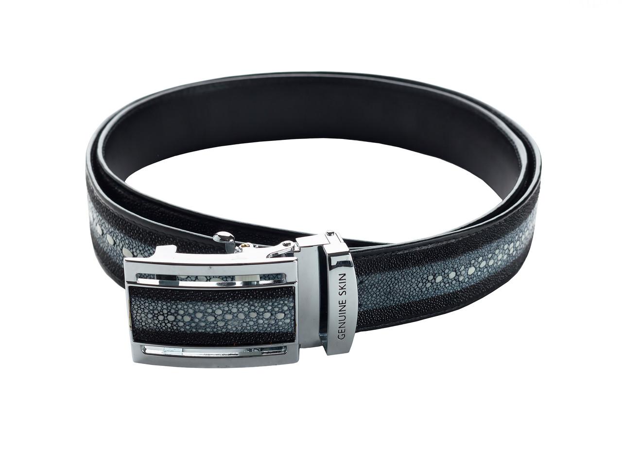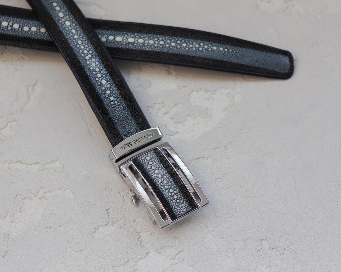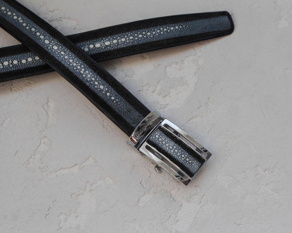 Ремень из натуральной кожи морского ската, для изготовления ремней данной модели используется кожа продолговатого морского ската, в качестве основного украшения ремня на лицевой поверхности полотна ремня пропущена спинная часть (в виде белой полосы) спинка шкурки морского ската. Ремень устроен на основании из телячьей кожи, прошит и проклеен по всей длине. Ремень укомплектован съемной автоматической пряжкой, в качестве основного украшения пряжки, на лицевой поверхности пряжки расположена вставка из кожи морского ската с горизонтальной белой полоской.