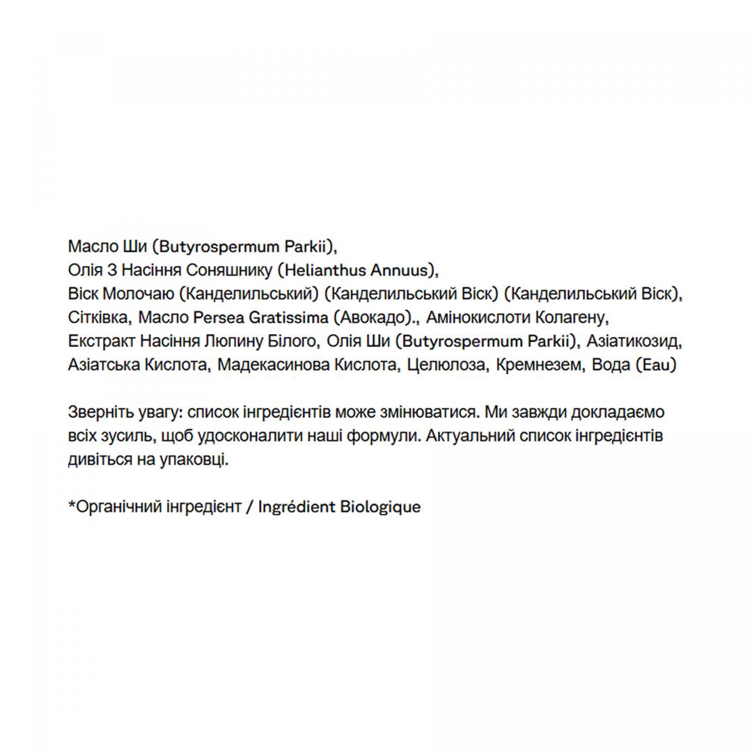 Масло ши (Butyrospermum parkii)., масло из семян подсолнечника (Helianthus annuus)., канделильский воск (Euphorbia cerifera) (Cire de candelilla), сетчатки, масло авокадо (Persea gratissima), аминокислоты коллагена, масло ши (Butyrospermum parkii)., азиатикозид, азиатиковая кислота, мадекасовая кислота, целлюлоза, диоксид кремния, вода (Eau).