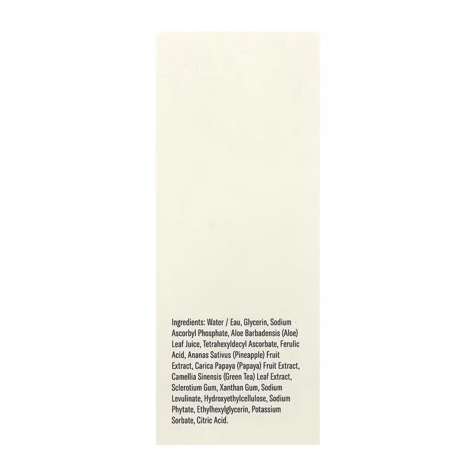 Вода (Eau), сок из листьев алоэ вера (Aloe barbadensis), тетрагексилдецил аскорбат, феруловая кислота, экстракт плодов ананаса (Ananas sativus)., экстракт листьев зеленого чая (Camellia sinensis), экстракт плодов папае, Ca ксантановая камедь, гидроксиэтилцеллюлоза, фитат натрия, этилгексилглицерин, сорбат калия, бензоат натрия, лимонная кислота.