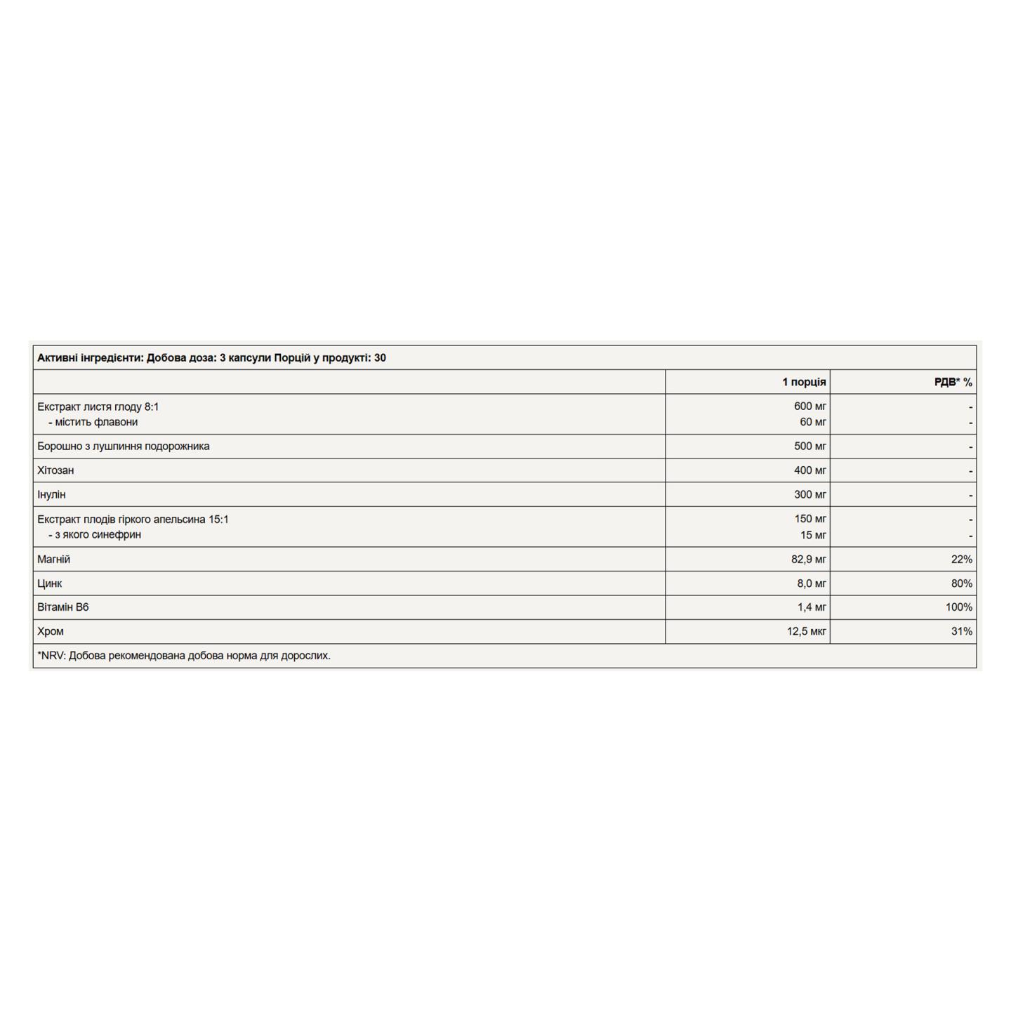 Состав: экстракт листьев боярышника (Crataegus Monogyna Jacq.) 8:1, экстракт шелухи подорожника яйцевидного (Plantago Ovate) 10:1, порошок хитозана (из ракообразных), оболочка капсулы [бичачий желатин, очищенная вода (из корня цикория), экстракт плодов горького апельсина (Citrus Aurantium L.) 15:1, оксид магния, оксид цинка, пиридоксина гидрохлорид, пиколинат хрома.