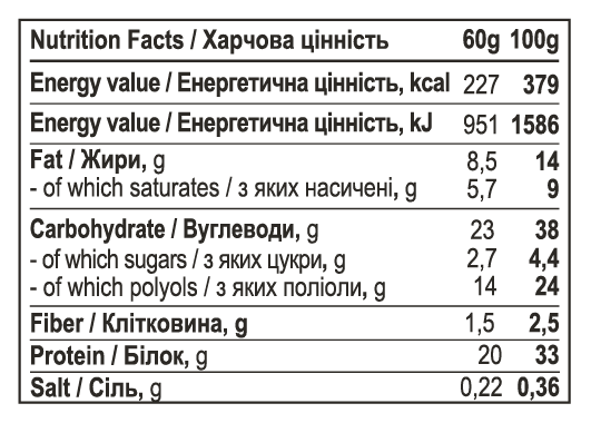 В составе продукта есть молочный белок 23%, карамель 16%, молочный шоколад с подсластителем 16%, увлажнитель глицерин, подсластитель мальтит, пептиды коллагена, кокосовое масло, соевый белок 3,2%, соевые чипсы с какао, какао подсолнечный лецитин, ароматизаторы.
