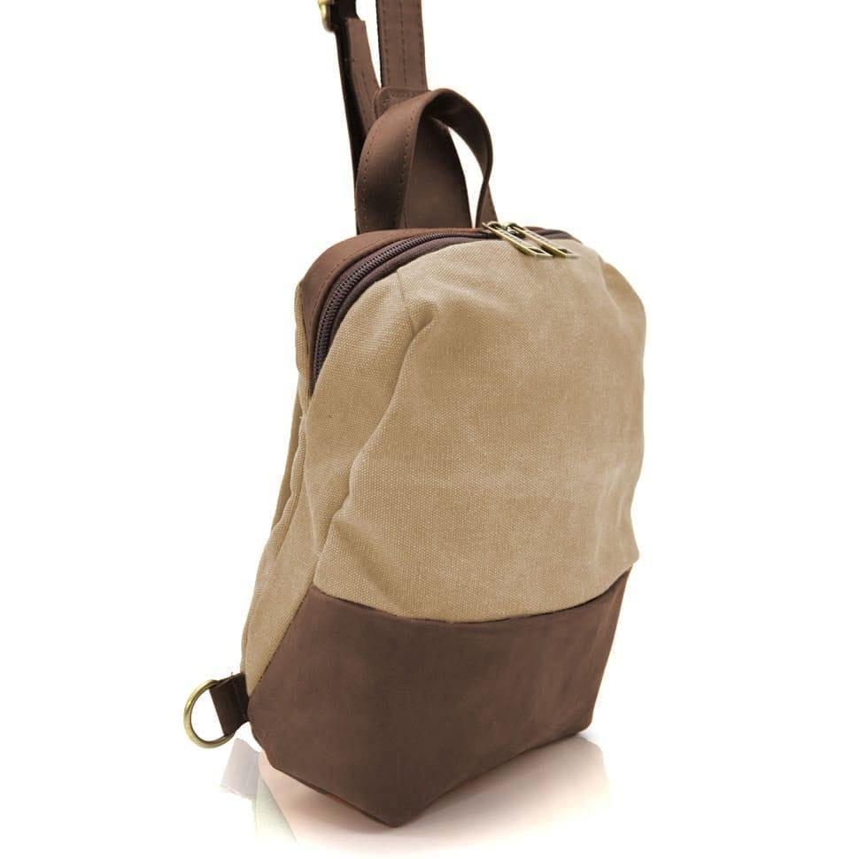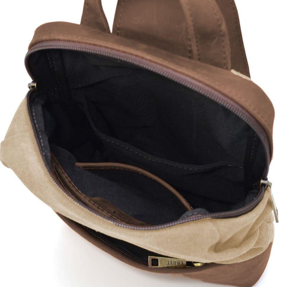 Рюкзак-слинг RСs-1905-3md имеет компактный и эргономичный дизайн, разработанный украинским брендом «TARWA». Модель скомбинирована из высококачественной натуральной кожи Crazy Horse и канваса (хлопчатобумажной ткани) и имеет такие преимущества по сравнению с цельным кожаным изделием: