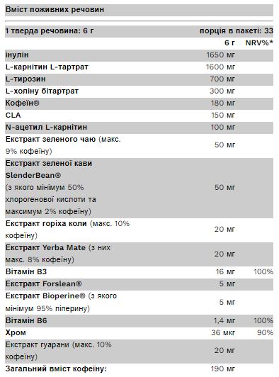 Рекомендуемая дозировка: потребляйте одну порцию (6 г – одна мерная ложка), смешанную с 300 мл литра воды за 15-30 минут до тренировки или между приемами пищи. Людям, чувствительным к кофеину, рекомендуется употреблять меньшую дозу. Не использовать за 4 часа до сна!