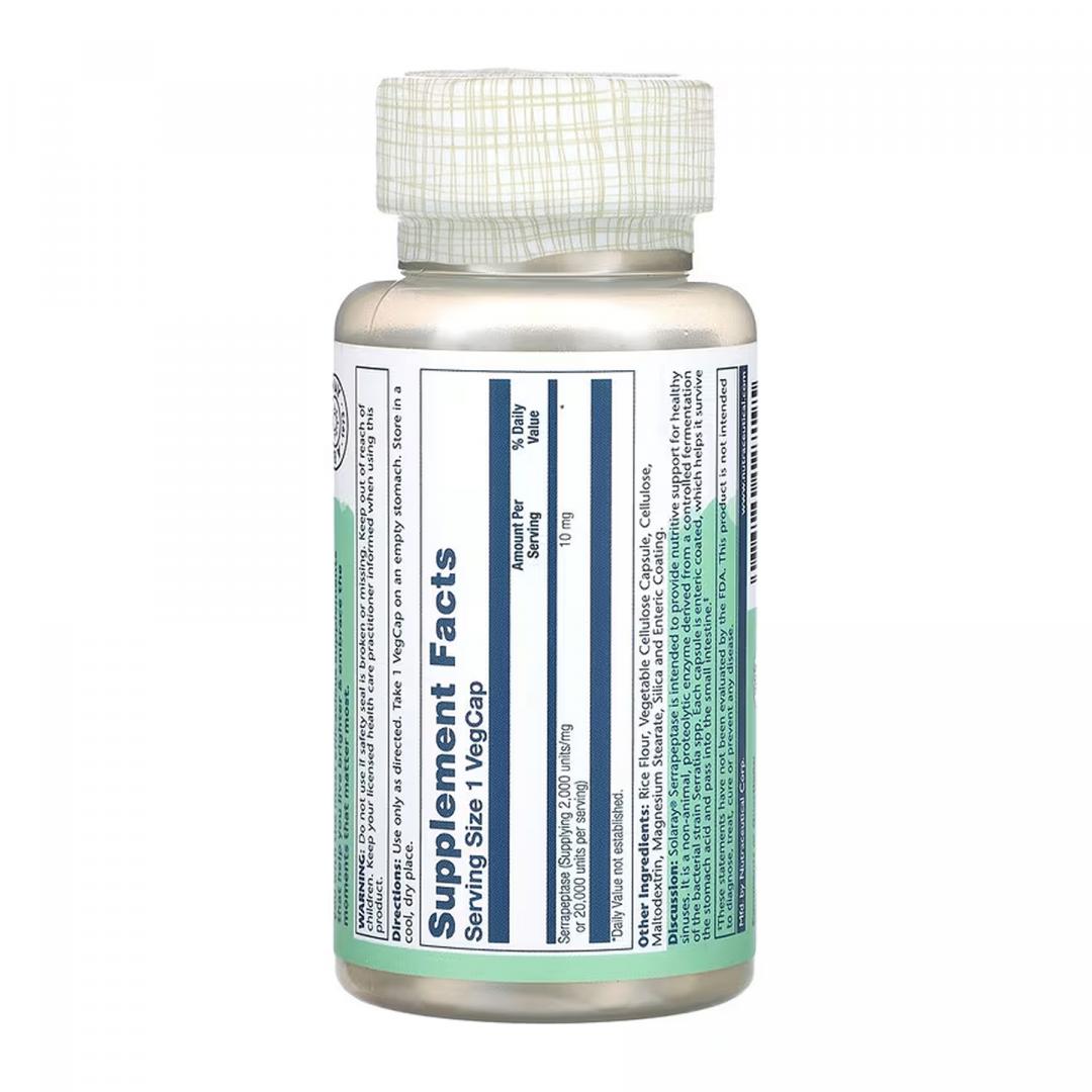 Информация о продукте. Серрапептаза Solaray® предназначена для обеспечения питательной поддержки для здоровья носовых пазух. Это протеолитический фермент не животного происхождения, полученный контролируемой ферментацией бактериального штамма Serratia spp. Каждая капсула покрыта кишечнорастворимой оболочкой, что помогает ей выдержать воздействие желудочного сока и проникнуть в тонкий кишечник.