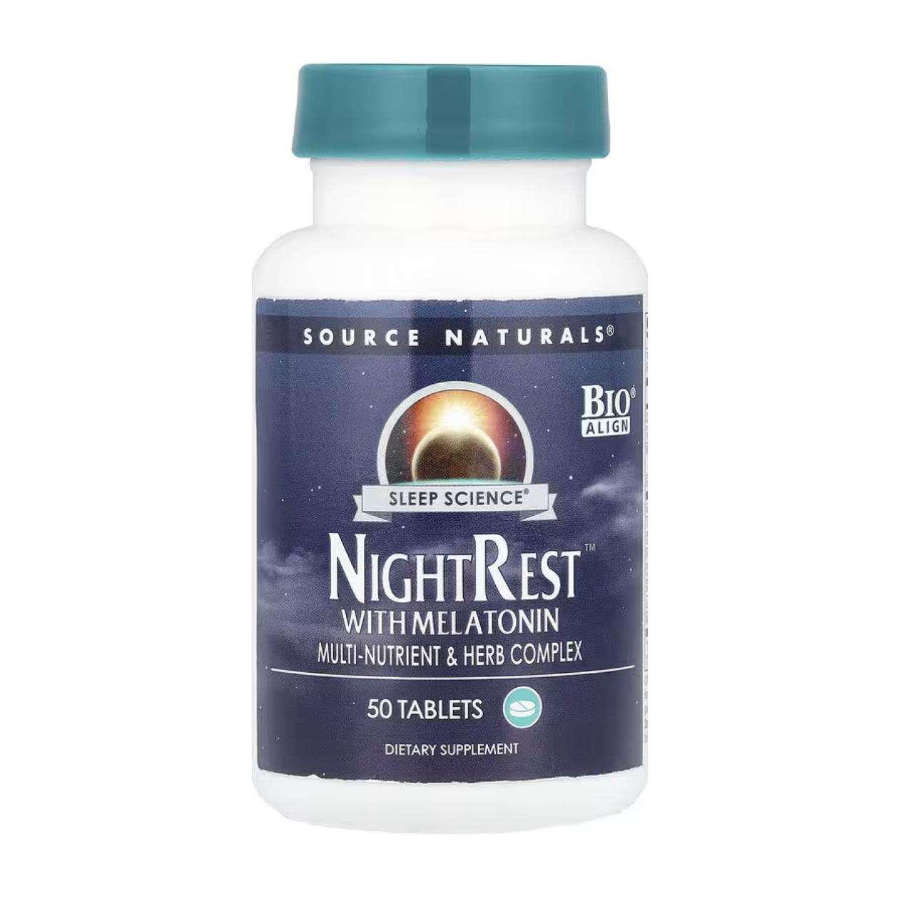 Source Naturals NightRest Melatonin – натуральная пищевая добавка, содержащая мелатонин, растительные экстракты и аминокислоты для улучшения сна и засыпания.