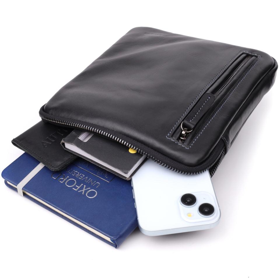 Элегантная мужская вертикальная сумка из натуральной гладкой кожи глубокого черного цвета. Минималистичный дизайн и аккуратная отделка подчеркивают статус владельца и делают аксессуар универсальным для любого стиля — от классического до повседневного.