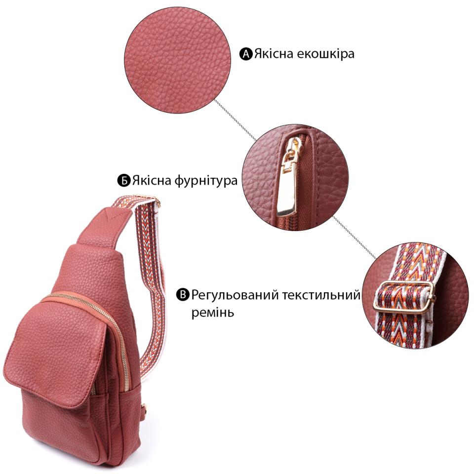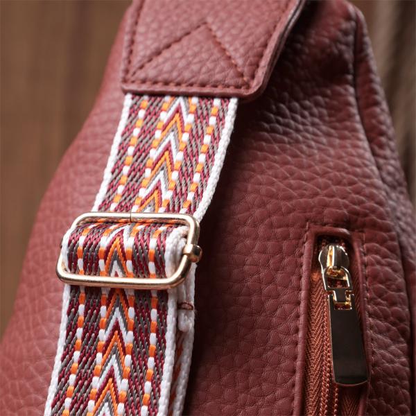 Женская слинг сумка из зернистой экокожи в интересном бордовом цвете. Данная модель состоит из одного основного отделения которое закрывается на молнию и в котором находится карман на молнии и четыре кармана для кредитных карт внутри, а также двух карманов снаружи и одного отверстия для кабеля или наушников, что очень удобно в современной мире. Акцентом данной модели является удобный регулируемый плечевой ремешок в этническом стиле, что очень модно уже несколько сезонов. Экокожа - высококачественная альтернатива натуральному материалу, которая очень устойчива к трению, к низким температурам, отлично носится в отличии от других искусственных материалов, а также имеет гипоаллергенный состав в отличии от натуральной кожи.