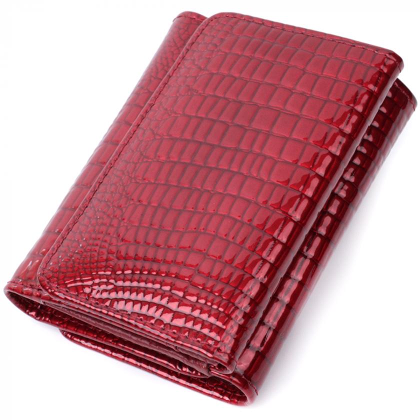 Женский яркий кошелек из натуральной лакированной кожи, с тиснением под рептилию. Модель имеет удобный размер и закрывается на магнит. Снаружи можно увидеть отделение для монет, которое закрывается клапаном на магнит. Аксессуар внутри оснащен двумя отделениями для купюр и восемью ячейками для карт. Упакован аксессуар в белую плотную картонную коробку с фирменным логотипом.